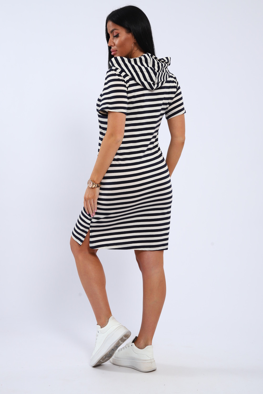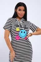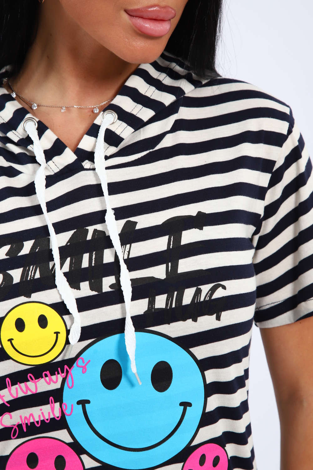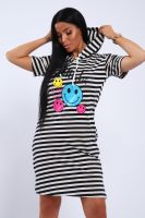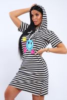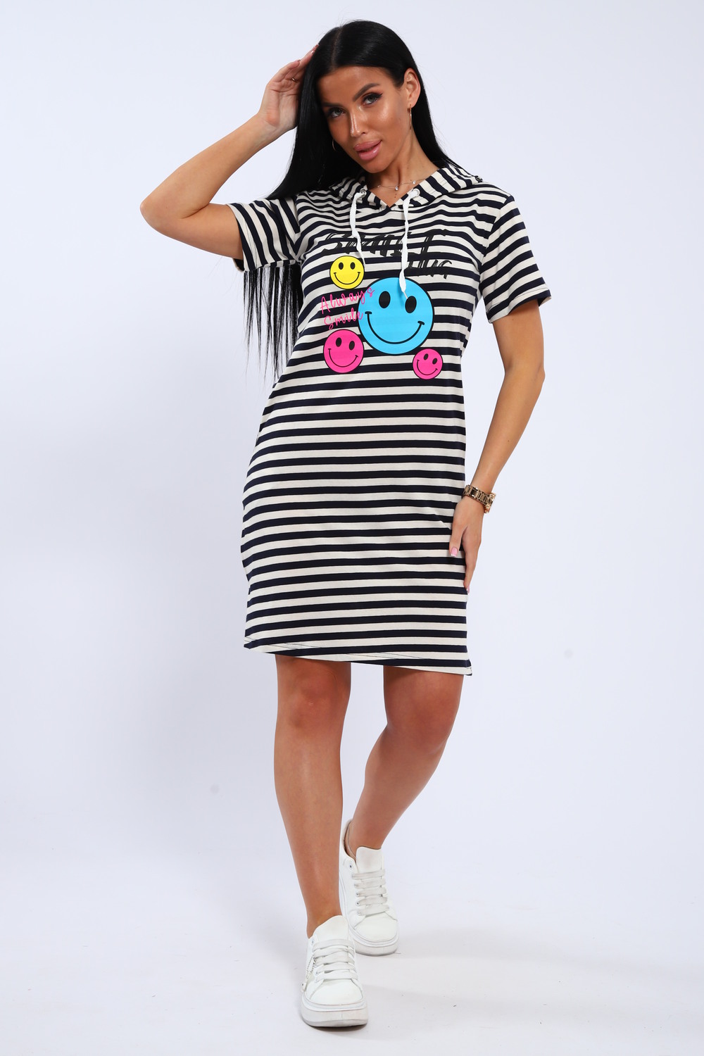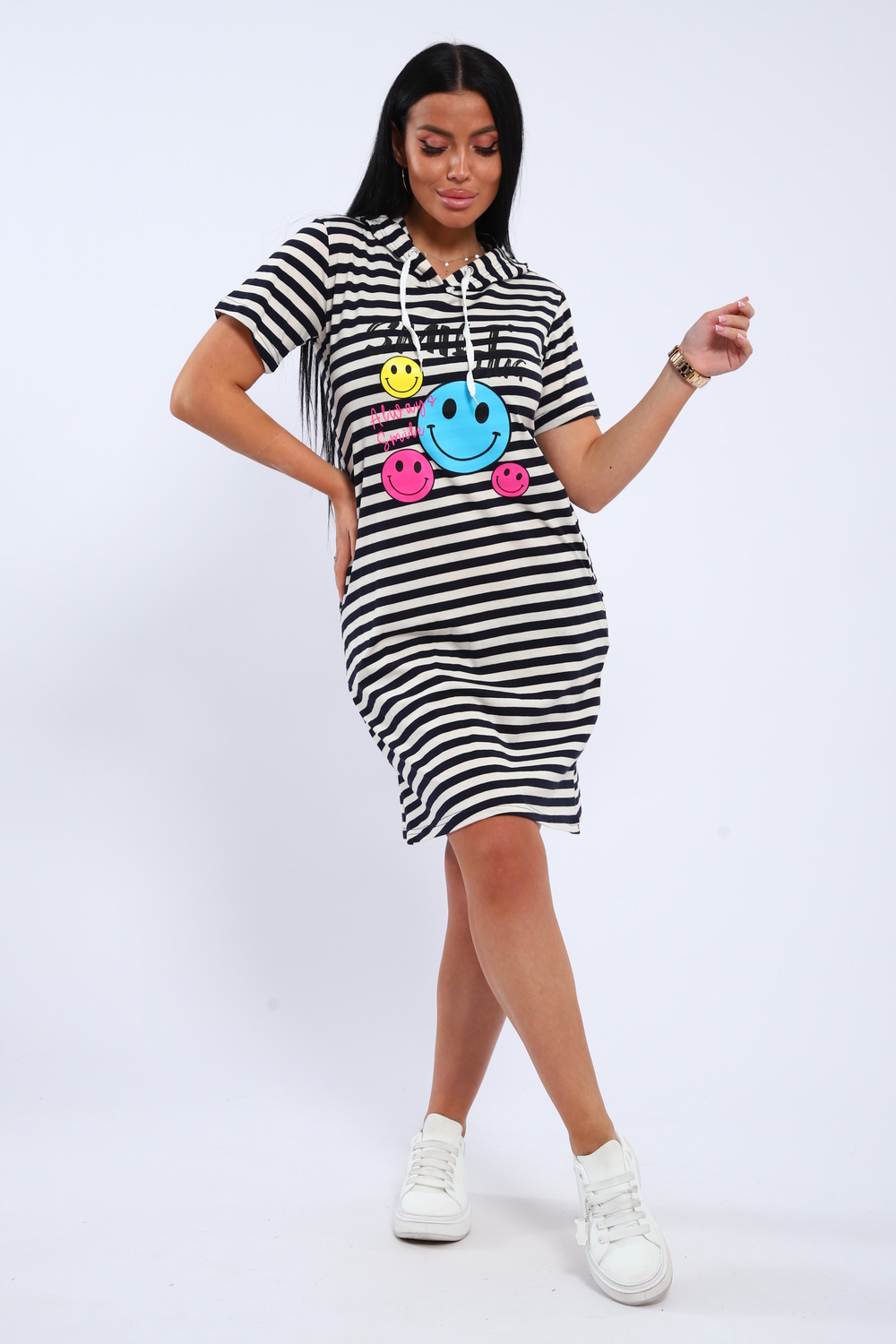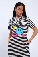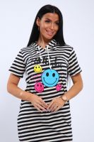 Воздушное хлопковое платье из кулирки в озорную полоску с веселыми смайликами на полочке станет приятным дополнением вашего летнего гардероба! Хлопок позволит чувствовать себя комфортно в любую погоду, капюшон поможет защитить волосы от любых природных воздействий, а полоска всегда напомнит о предстоящем отдыхе на море!
