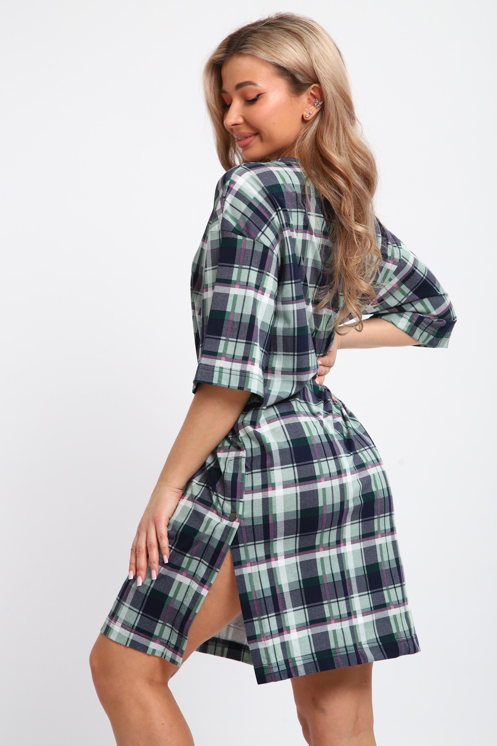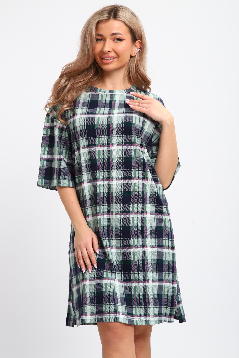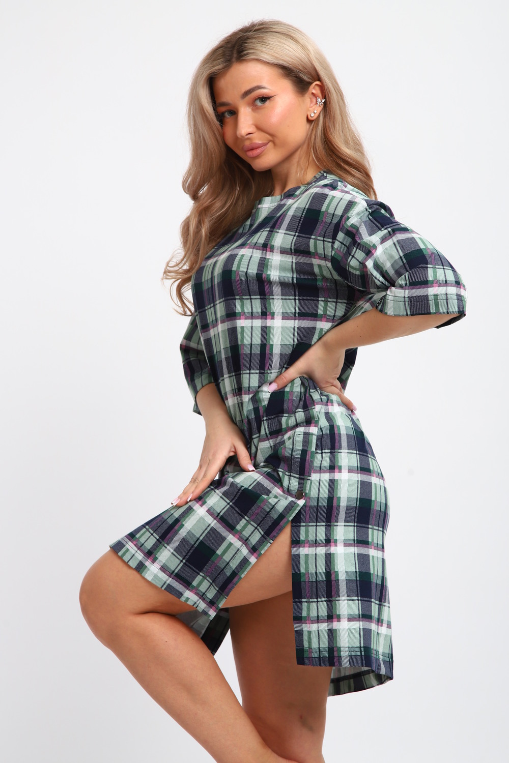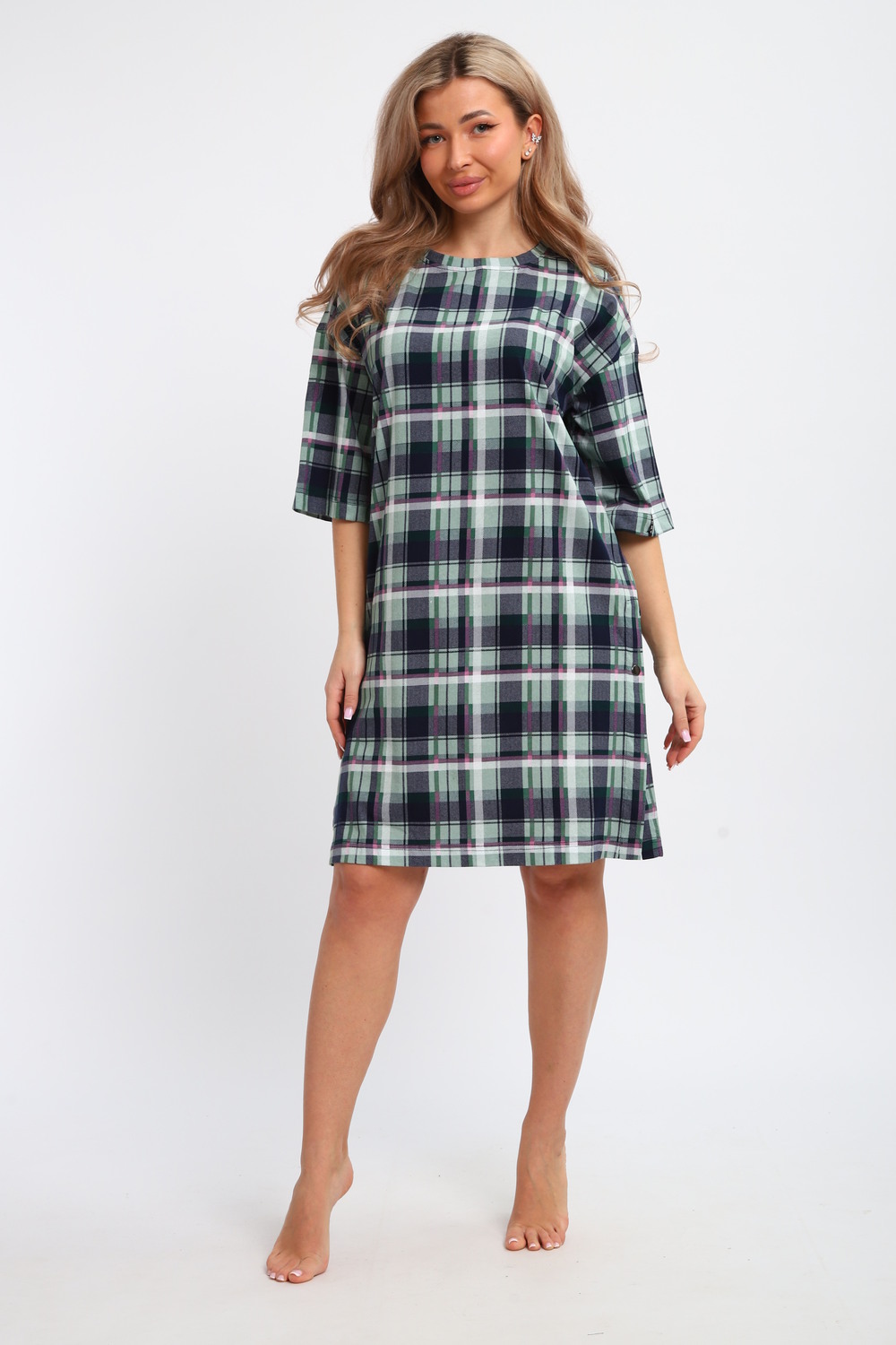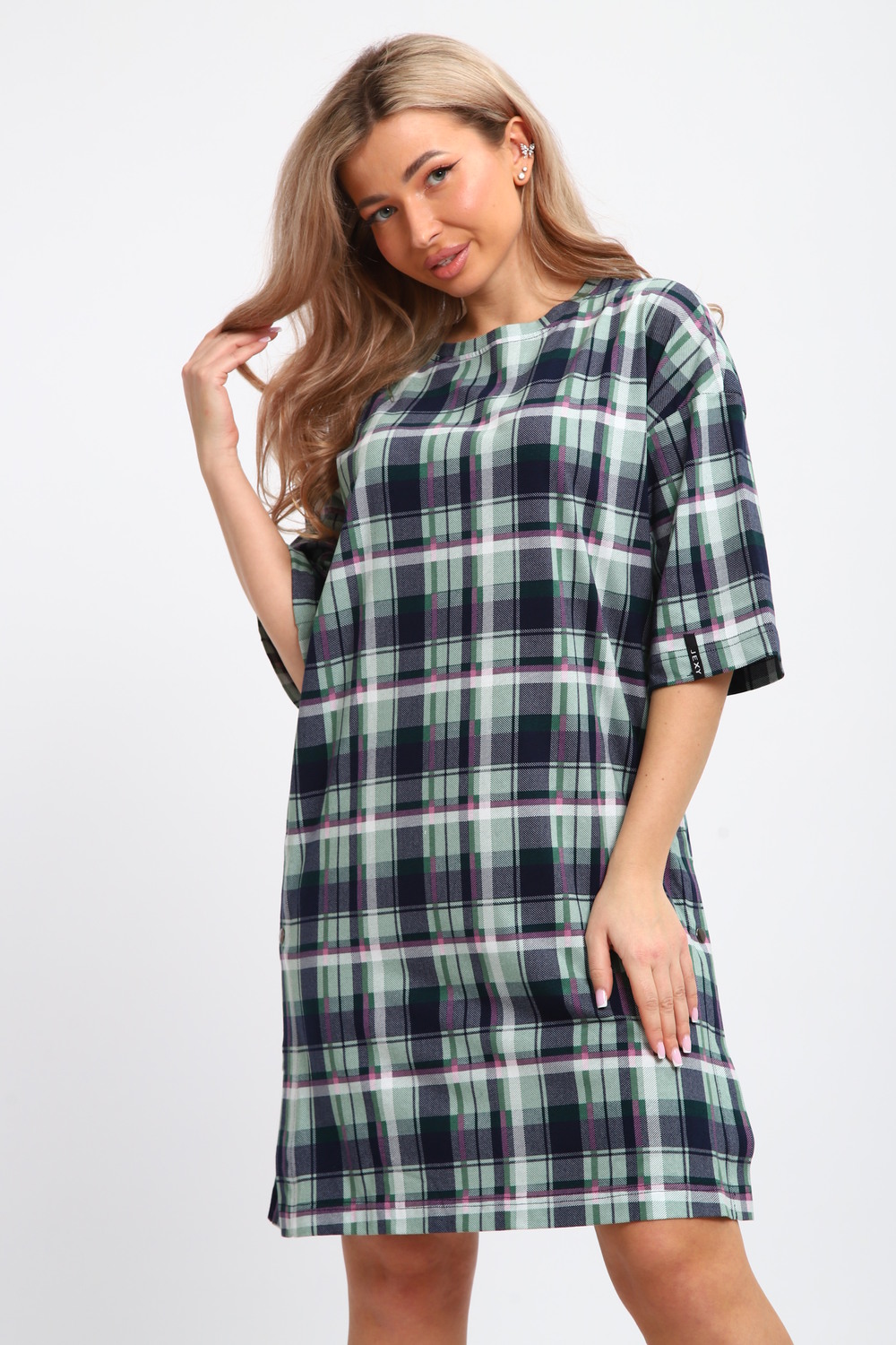 Туника женская JEXY – идеальный выбор для комфортного пребывания дома. Эта длинная одежда мягкая и приятная к телу благодаря использованию хлопка. Она прекрасно подходит для беременных женщин, обеспечивая удобство и свободу движений благодаря оверсайз силуэту. Трикотажная ткань подчеркивает её стиль, а крупный клетчатый узор добавляет характер. Повседневная туника свободно облегает фигуру, не создавая ощущение стесненности. Уникальная длина изделия позволяет носить его как самостоятельный элемент одежды или вместе с другими вещами, в зависимости от ситуации. Отсутствие карманов оставляет поверхность ровной и чистой, избегая дополнительных объемов. Рукавом 3/4 она прикрывает руки до локтя, что даёт возможность чувствовать себя защищенно и при этом сохраняет достаточную вентиляцию. Это делает её подходящей для использования в различные сезоны. Предпочтение хлопковым материалам гарантирует гипоаллергенность и безопасность даже для нежной кожи. Хлопковая домашняя одежда подходит для разных размеров благодаря своему простому фасону. Большие размеры делают модель доступной даже для тех, кто предпочитает более просторные варианты. Под такую тунику легко подобрать дополнительные элементы гардероба или использовать как легкую ночную рубашку. Эта большая свободная вещь отлично подойдёт тем, кто ценит практичность и комфорт. Клетчатое оформление придает ему современный вид без излишней вычурности, сохраняя лояльность к традиционной эстетике моды. Важно отметить универсальность туники: её можно носить не только дома. Благодаря продуманному дизайну она будет уместна на прогулке или во время отдыха на природе. Мягкость трикотажных материалов за счёт основного состава повышает комфортность подобных изделий во много раз. Подарок на Новый год под елку, на Рождество или любой другой праздник. Новогодние и рождественские каникулы - время приятных посиделок. Встречайте 2026 год лошади!