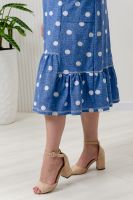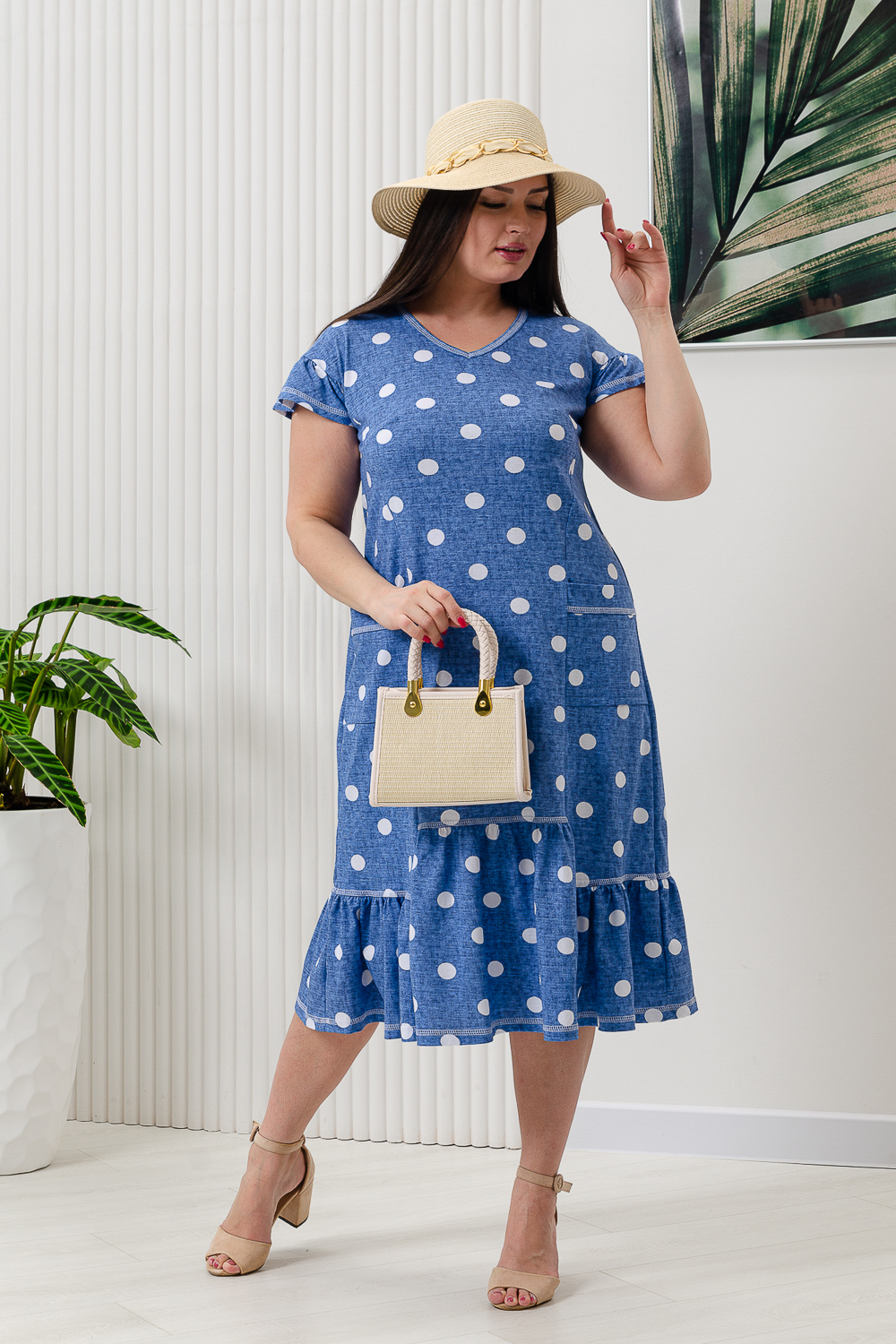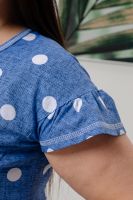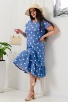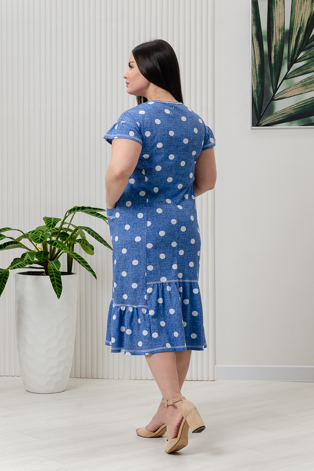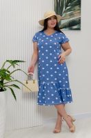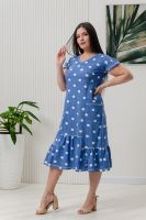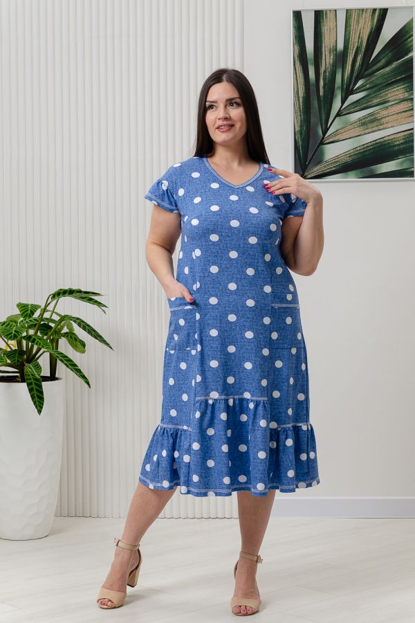 Платье женское полуприлегающий силуэт, рукав короткий цельнокроеный со сборкой. На полочке и спинке рельефы. Внизу платья рюша центральной части несколько выше боковой. На боковой части полочки накладные карманы с обтачкой. Горловина У-образной формы, окантована бейкой.