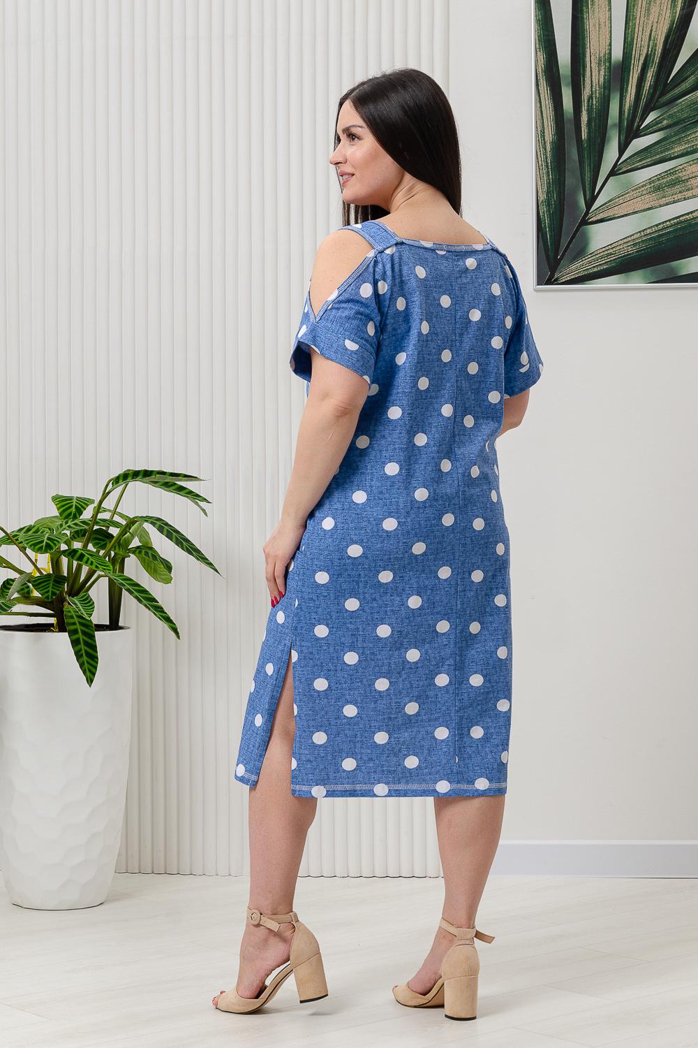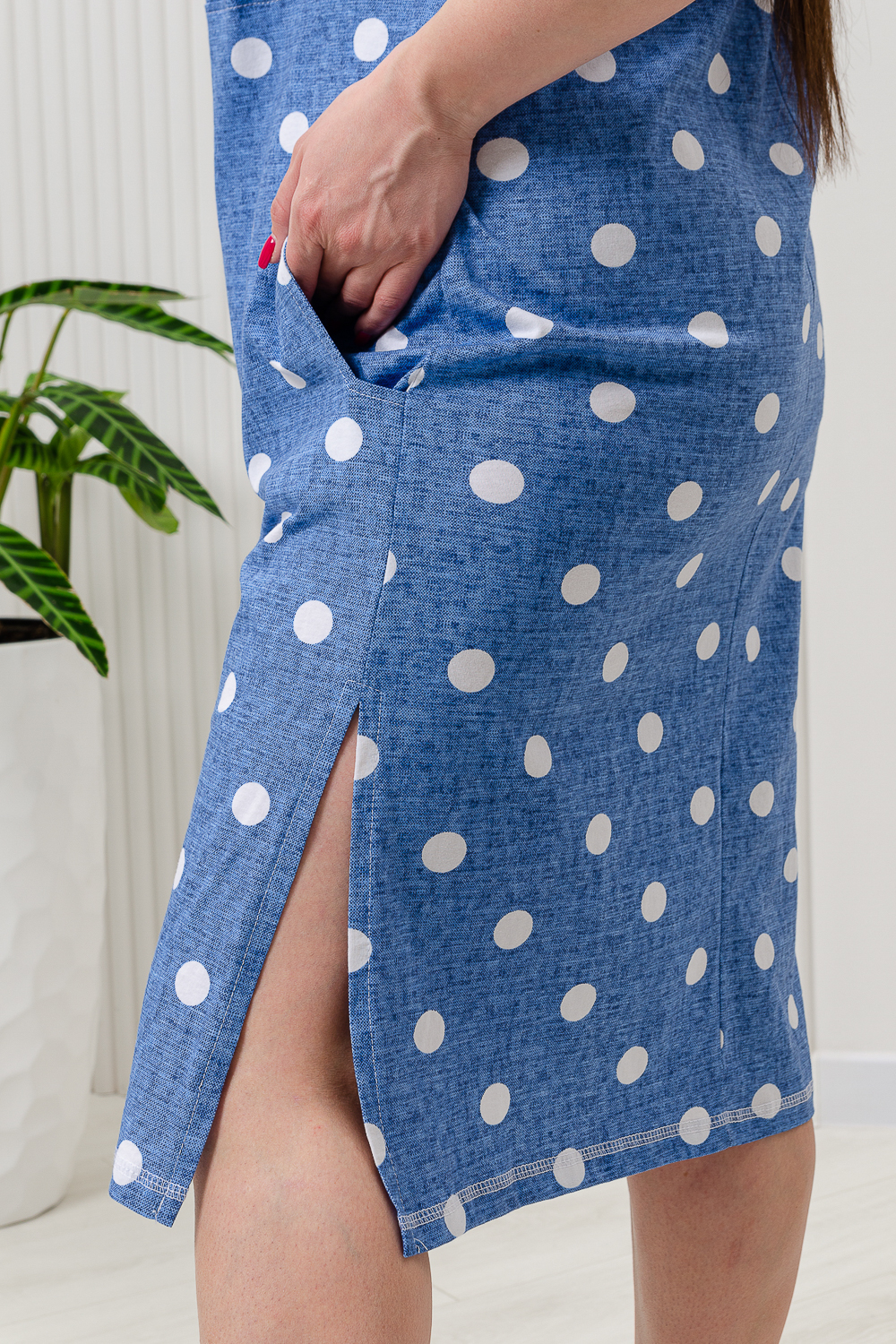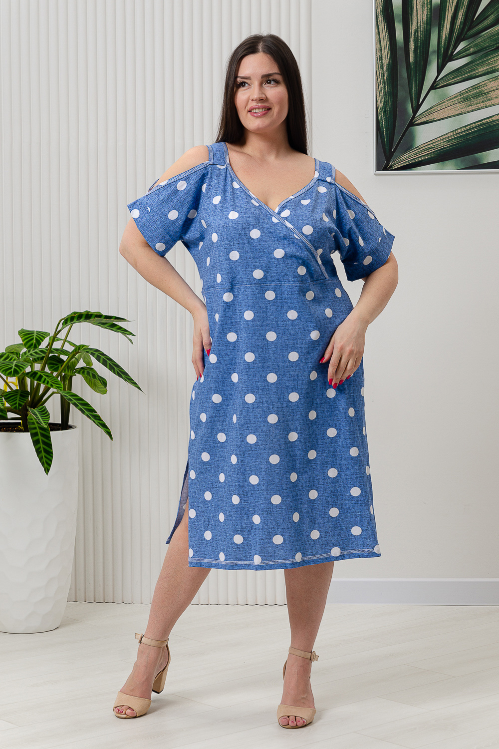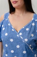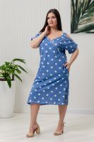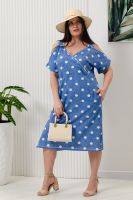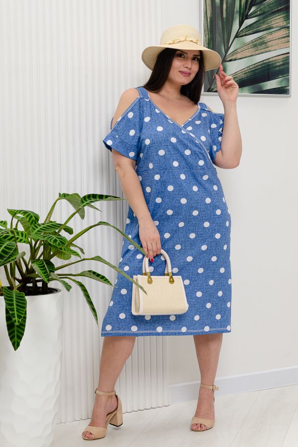 Платье женское полуприлегающего силуэта. Платье с запахом в верхней части. В нижней части на полочке внутренние фигурные карманы. На плечах широкие удобные бретели , переходящие в открытый цельнокроенный рукав на манжете.
