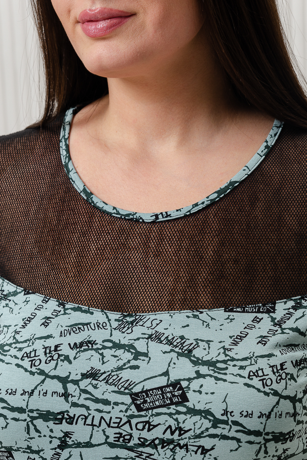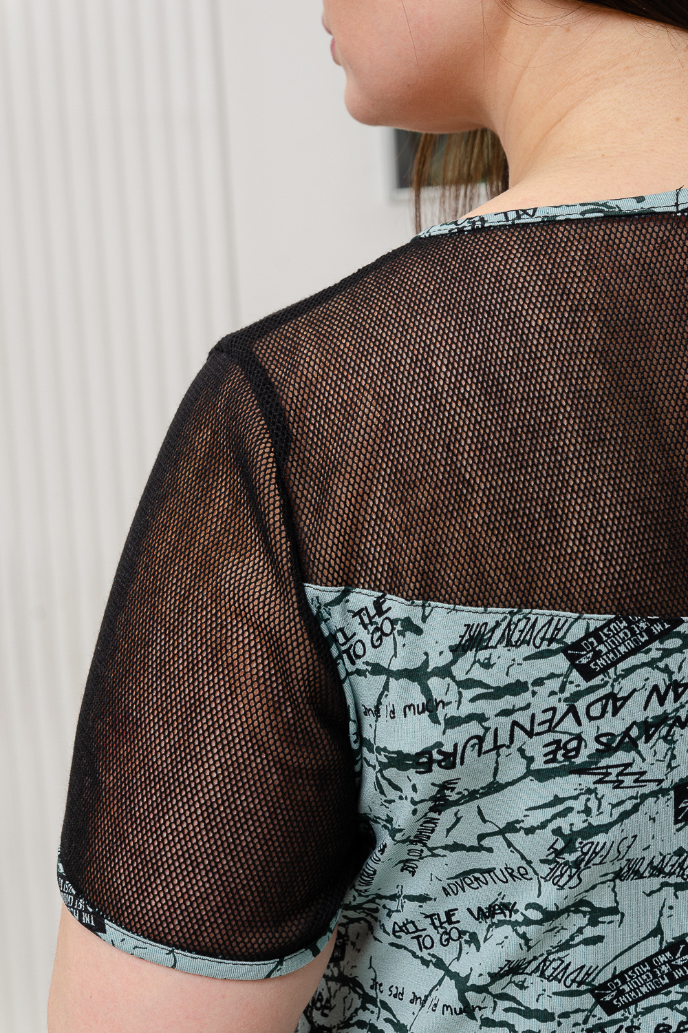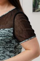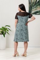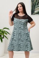 Платье полуприлегающего силуэта, расширенное к низу. Горловина округлая, рукав втачной короткий. Кокетка полочки и спинки, рукав из х/б сетки. В боковых швах внутренние карманы.