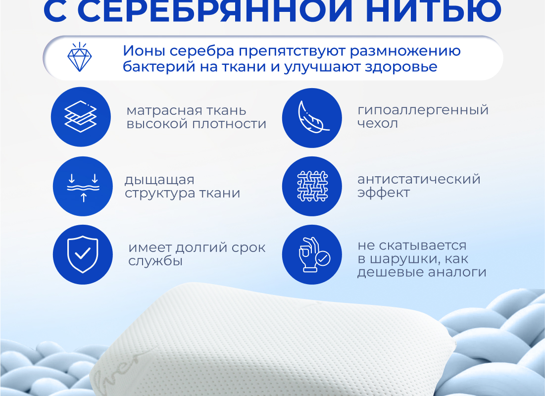 Подушка анатомическая с эффектом памяти Асветида Silver (50х70 см) обладает классической формой с закругленными краями. Это обеспечивает правильное положение головы и шеи во время сна. Благодаря вспененной структуре наполнителя, анатомическая подушка эластичная, что способствует комфортному и здоровому сну. В структуру ткани включена серебряная нить. Необыкновенно красивый чехол, выполненный из этой ткани, обладает антибактериальными, антистатическими и гипоаллергенными свойствами. Гарантирован долгий срок службы ткани, в отличии от конкурентов с более дешевыми материалами. Наволочка при эксплуатации и стирки НЕ скатывается в шарушку и держит структуру ткани. В составе пена с эффектом памяти – это инновационный материал, который называется пенополиуретан. Благодаря материалу «Мемори», или как его еще называют «Мemory Foam», мышцы шеи полностью расслабляются во время сна, а шейный отдел позвоночника остается в правильном положении. Анатомическая форма позволяет принять комфортное положение во время сна на боку, на животе или на спине. Кроме того, подушка предотвращает отеки лица, которые могут возникнуть при неправильном положении головы. Изготовлена из дышащих экологически чистых материалов. Благодаря этому поддерживается комфортная температура покрытия во время сна.