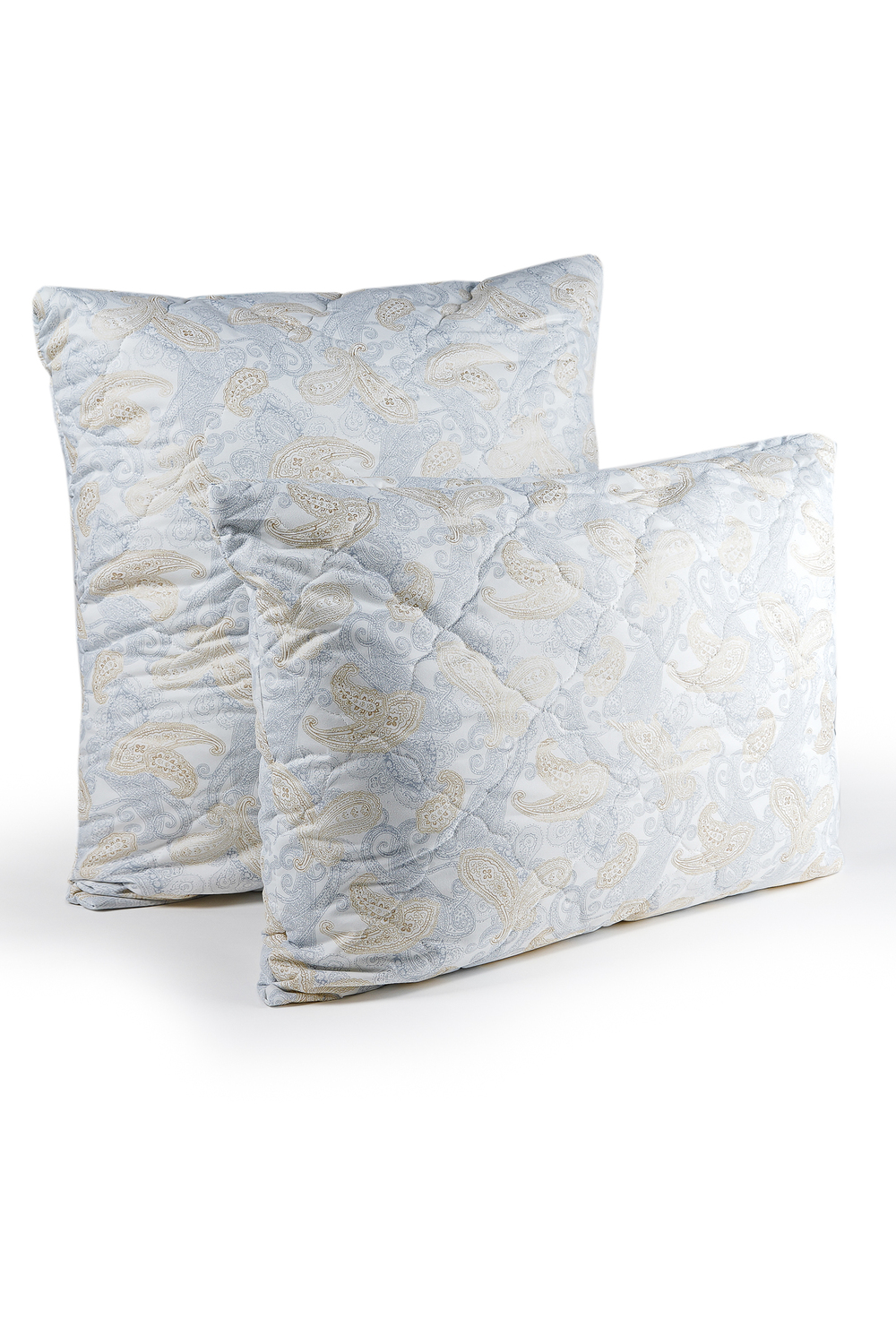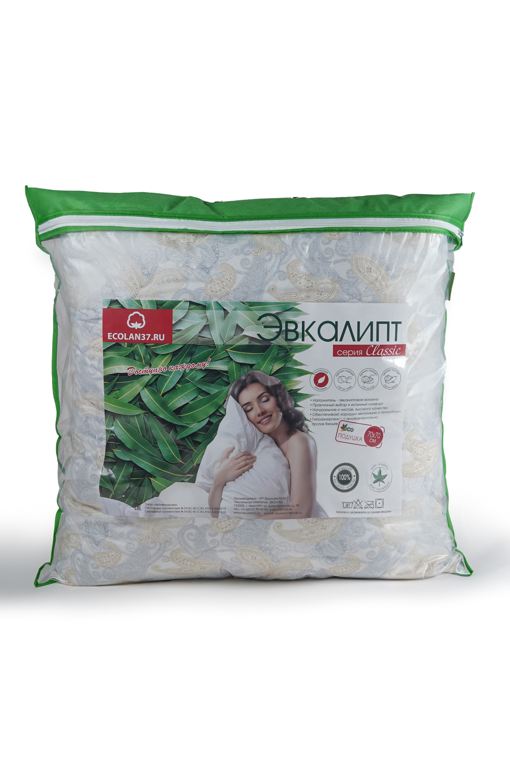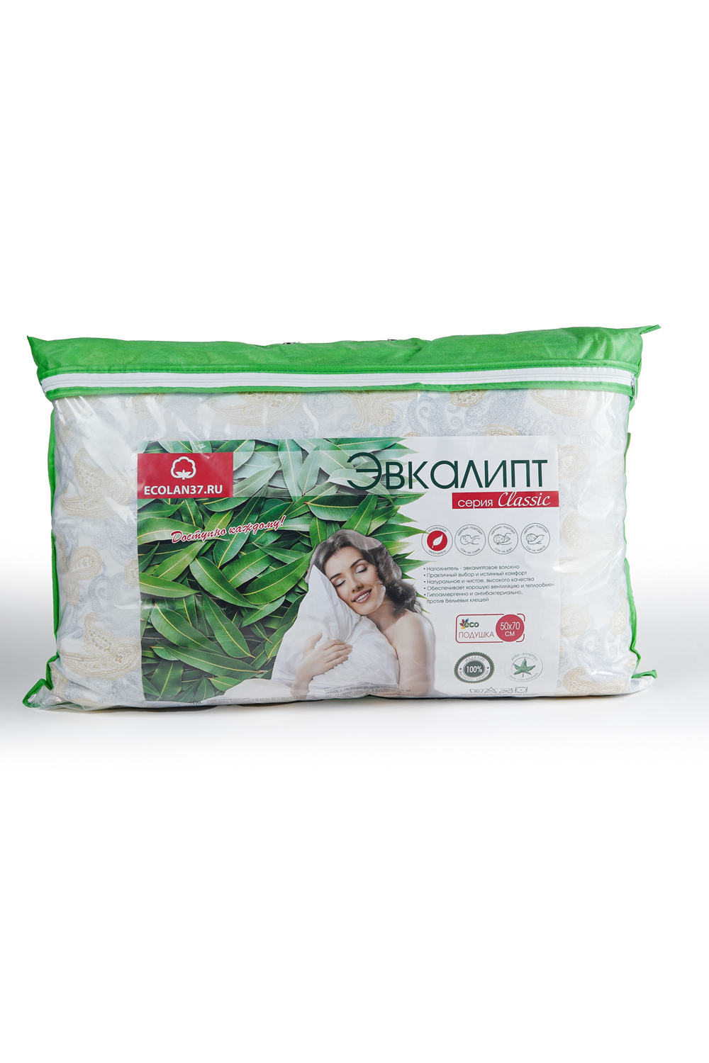 Размер - 50х70см, 60х60см, 70х70см. Стеганый чехол - тик, 100% хлопок с пуходержащей синтетической пропиткой. Наполнитель чехла - эвкалиптовое волокно 50%, полиэфирное волокно 50%. Двухкамерная, сменный картридж. Наполнитель картриджа - искусственный лебяжий пух. Допускается отклонение по размерам +/- 1,5 см, если это не снижает качество изделия.