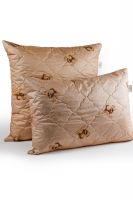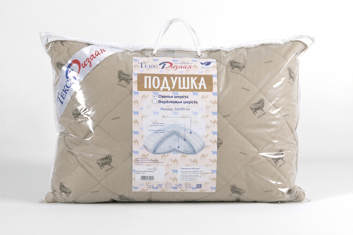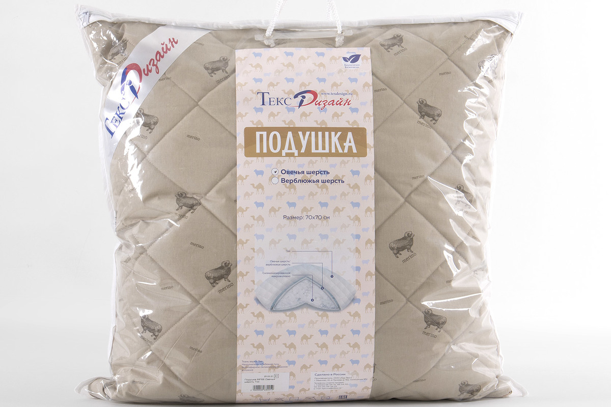 Размер - 50х70см, 60х60см, 70х70см. Стеганый чехол - тик, 100% хлопок с пуходержащей синтетической пропиткой. Наполнитель - овечья шерсть 50%, полиэфирное волокно 50%, двухкамерная, сменный картридж. Наполнитель картриджа - искусственный лебяжий пух. Допускается отклонение по размерам +/- 1,5 см, если это не снижает качество изделия.