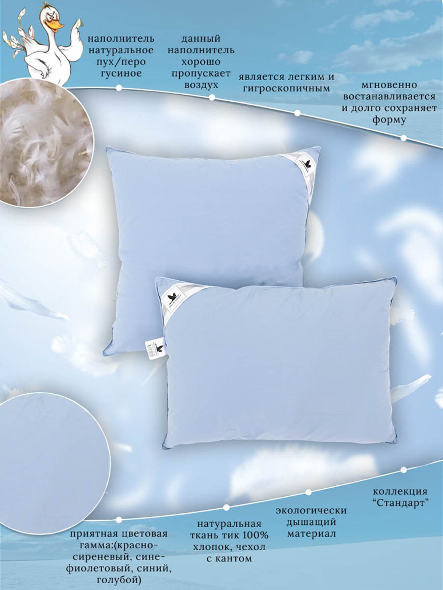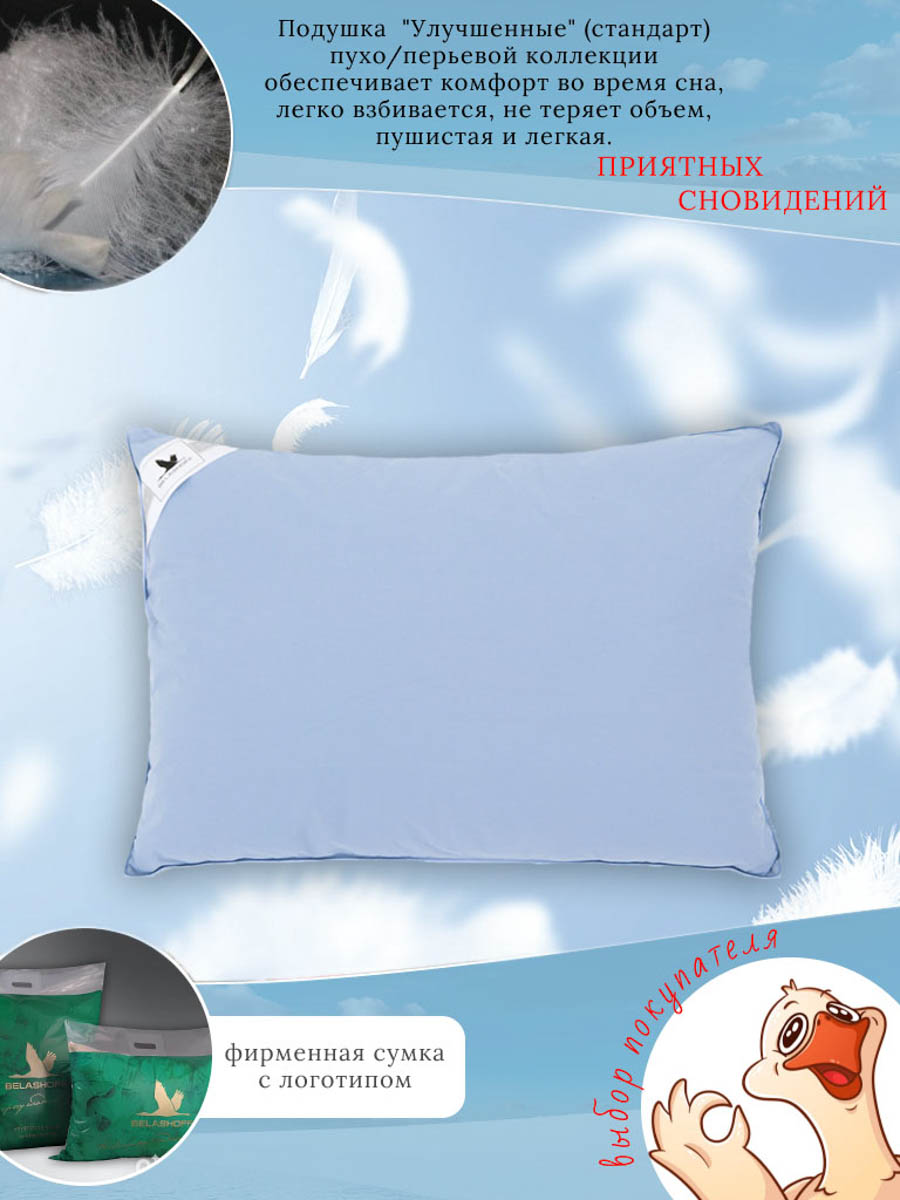 Подушки коллекции Улучшенные-стандарт пухо-перовые. Это натуральный и комфортный выбор для вашего сна. Подушки наполнены 30%натуральным гусиным пухом и 70%гусиным пером. Такой состав обеспечивает хорошую поддержку ,даря вам мягкость и комфорт на протяжение всей ночи ,легко взбиваются, не теряют объём, обеспечивают комфорт и поддержку головы и шеи во время сна сохраняя свою форму на протяжение длительного времени.