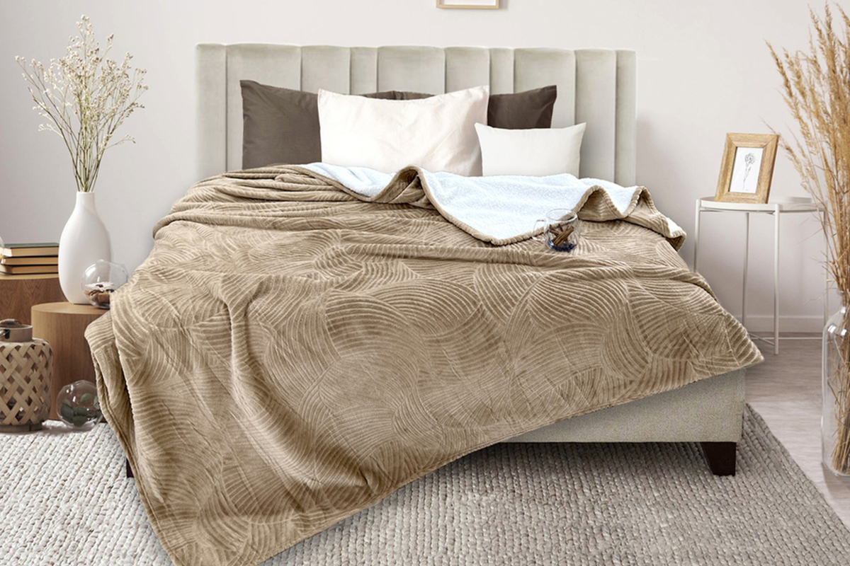 Плед-покрывало из велсофта. Красивый рисунок, приятная оборотная сторона, можно отогнуть при застилании кровати. Отличный вариант для подарка, достойный и красивый. Верхний слой с выбитым рисунком (стрижка) плотность 190 гр, Нижний слой шерпа плотностью 160 гр Слои между собой склеены, и составляют единое полотно.