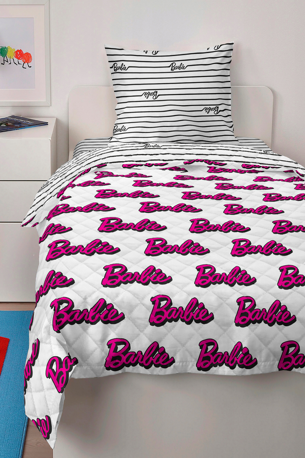BARBIE - самая популярная кукла, которую просто обожают все девочки без исключения! Специально для поклонниц этих кукол разработан стильный дизайн стеганого покрывала в стиле BARBIE. Яркий розовый цвет и фирменный логотип BARBIE позволит оформить детскую комнату в ярких красках! Стеганое покрывало BARBIE - отличное дополнение к постельному белью. Покрывало двустороннее — можно менять настроение комнаты, просто переворачивая его. Оно выполнено из высококачественной ткани поплин (100% хлопок), что гарантирует долговечность и практичность. Покрывало легко стирается и не теряет форму после стирки, что порадует любую маму. Стеганые покрывала BARBIE отлично подойдут в качестве подарка ребенку!