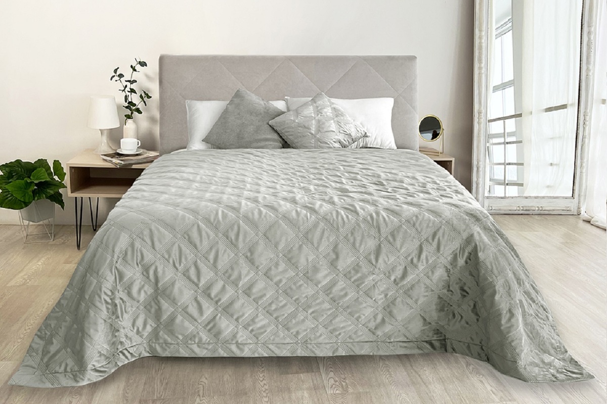 Шикарное стеганое покрывало из велюра. Мягкое и нежное по тактильным ощущениям. Создаст стиль и уют в комнате. Состав покрывала 100% п/э: верх велюр плотностью 210 г/м2, наполнитель синтепон 60 г/м2, подкладка микрофибра 65 г/м2.