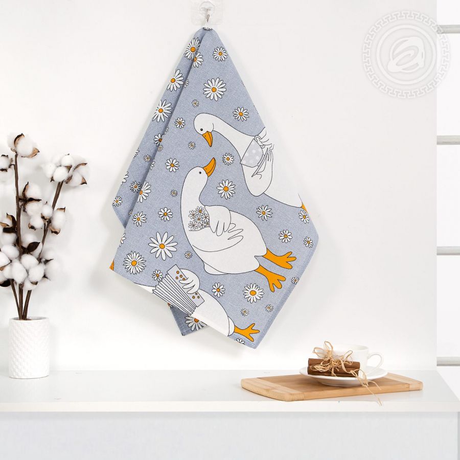 «Ромашки» – полотенце из рогожки с летним колоритом. На рисунке полевые цветы, а на переднем плане веселые гуси. Они очень обаятельные и забавные. Вот один из них играет на гармошке, а другой собирает ромашки, а третий пьет чай. Все персонажи вызывают умиление. Авторская композиция создает летнее настроение и дарит ощущение уюта. Полотенце с гусями – чудесный подарок для оформления кухни.