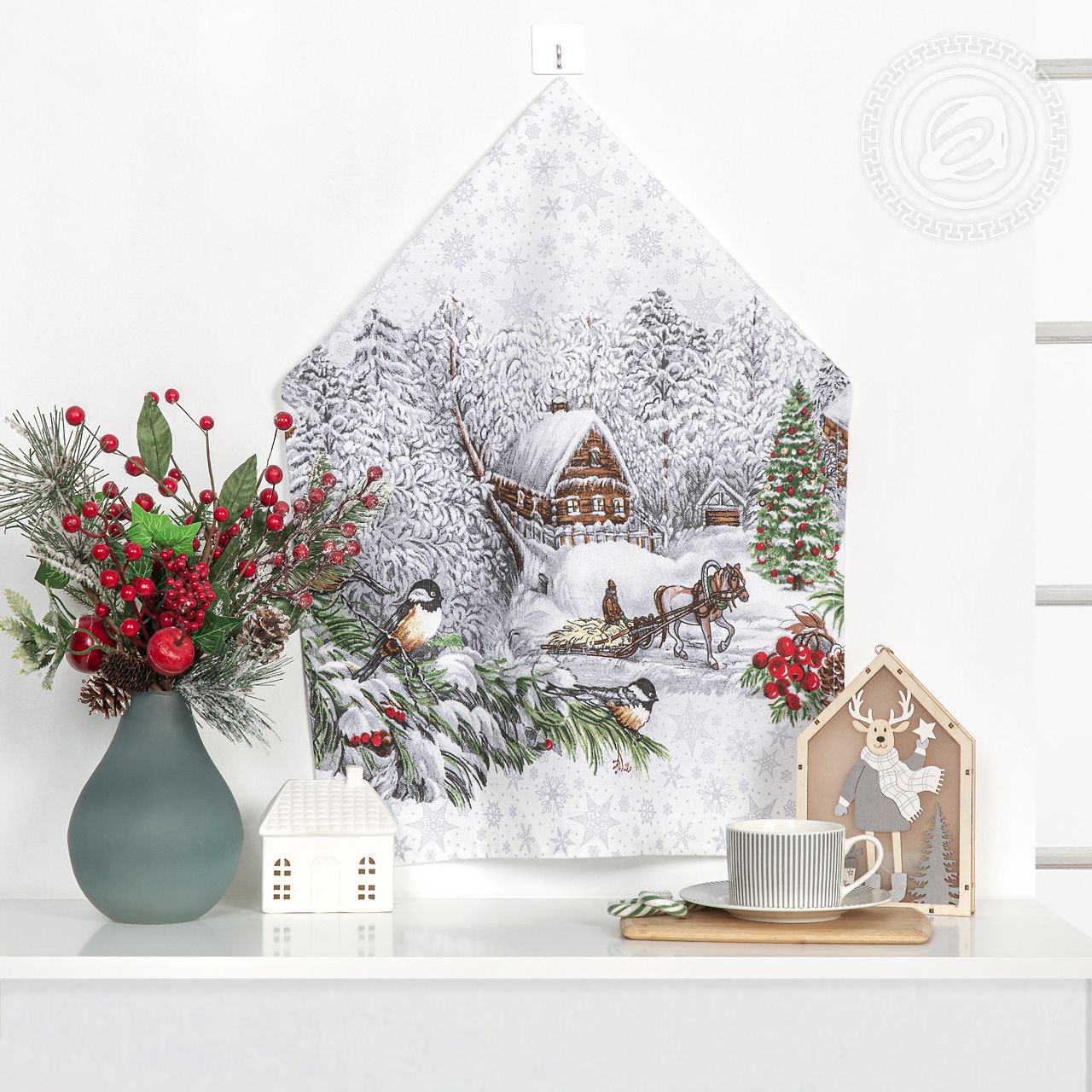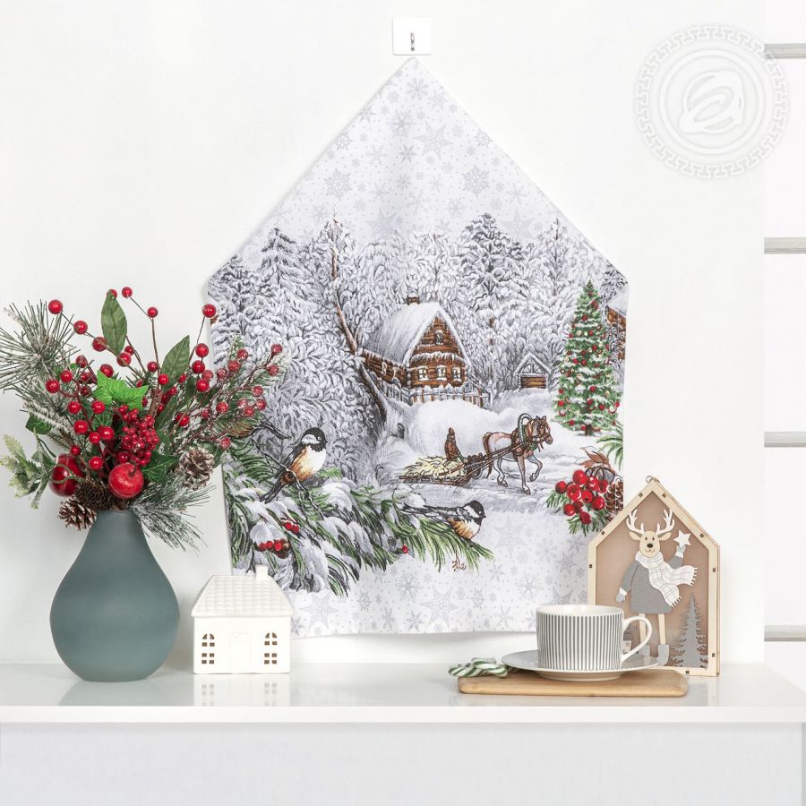«Однажды в студеную зимнюю пору», – при взгляде на новогодние полотенца из рогожки вспоминается строка стихотворения Н.Некрасова. Перед нами деревенский пейзаж с маленькими и уютными улочками, большими сугробами, нарядной ёлочкой и деревянными избами. Любуешься авторским рисунком и как будто чувствуешь и легкий морозец, и хруст снега. Это чудесный акцент в интерьере кухни, который дарит чувство праздника и приятной ностальгии.