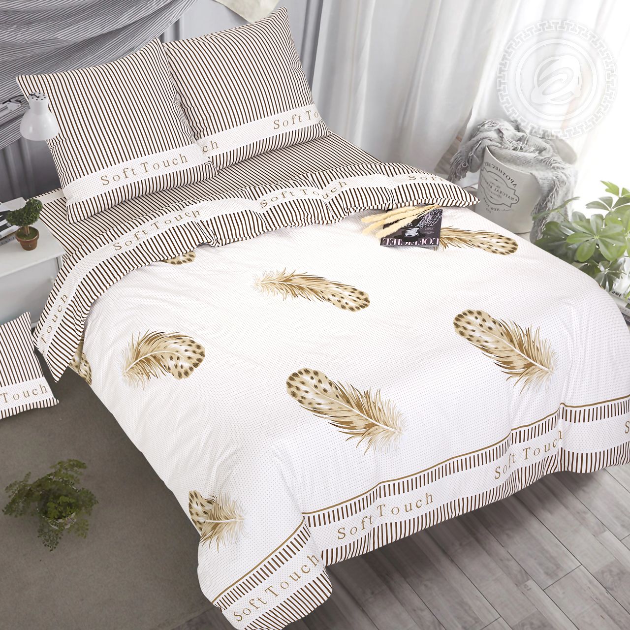 Кремово-пастельный фон рисунка заполнен сплошным точечным орнаментом. На нем свободно располагаются изящные легкие перья, выполненные в оттенках бежевого и шоколадного цвета. Бордюр рисунка отделен тонкой светло-коричневой линией и очень короткими вертикальными полосками, повторяющимися сверху и снизу. Посередине бордюра – декоративная надпись на английском «Soft Touch» - «нежное прикосновение».