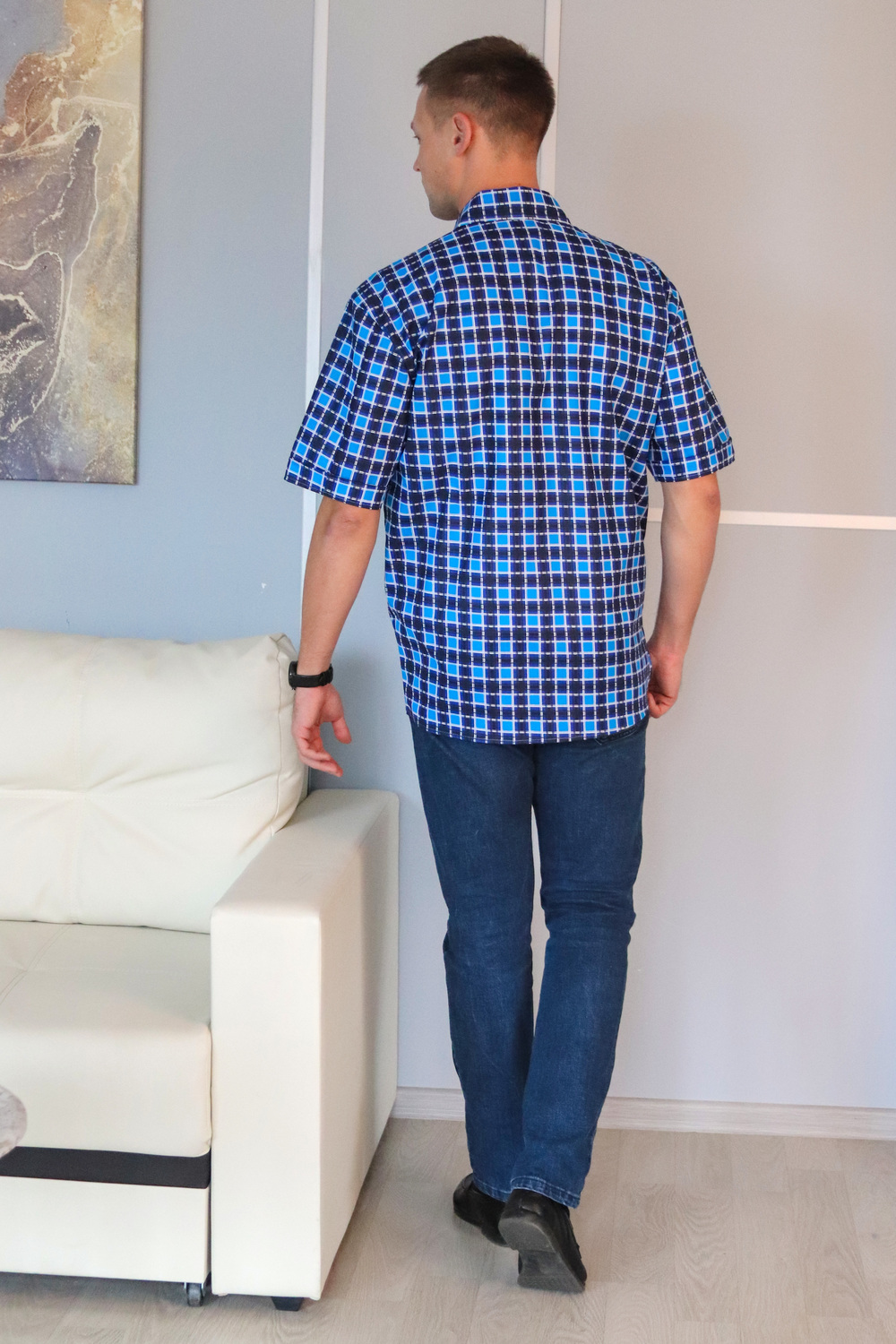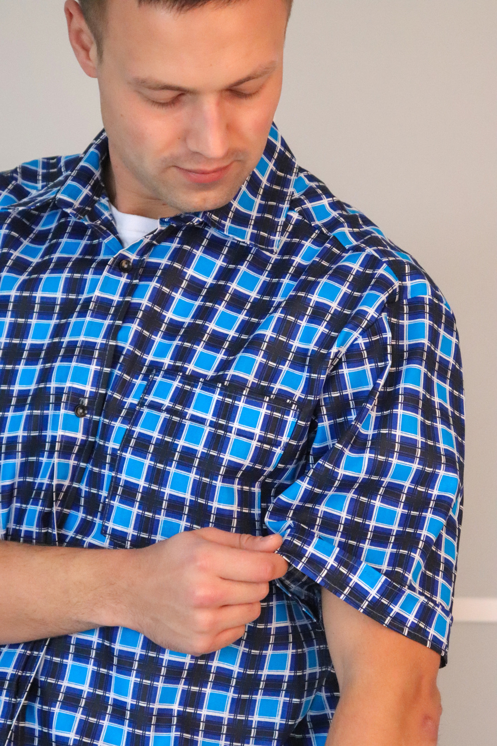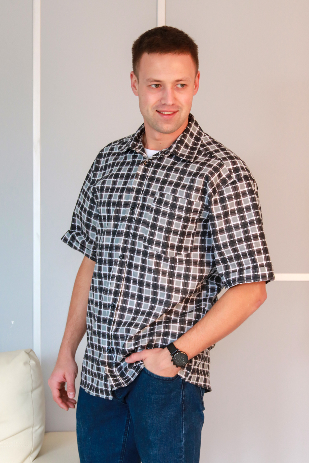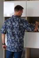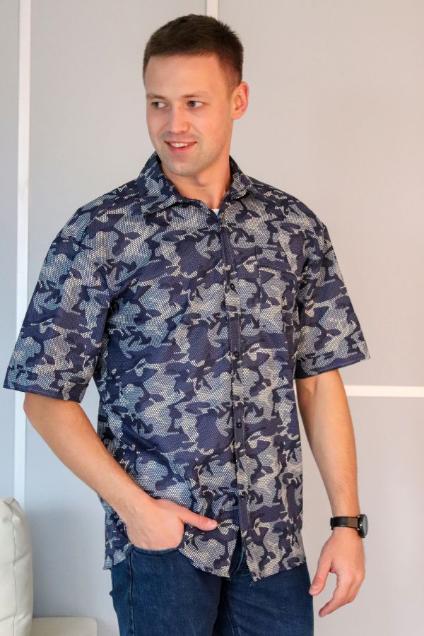 Мужская рубашка с коротким рукавом. Ткань бязь 100% хлопок. Модель свободного кроя, дополнена одним карманом с цельнокроеной планкой. Планка на полочке цельнокроеная, застегивается на пуговицы. Плечо приспущено, рукав с цельнокроеной планкой. Воротник на стойке, проложен флизелином с отстрочкой. Низ изделия застрачивается швом вподгибку при помощи специального приспособления. Внимание! Данный товар по цвету не подбирается.
