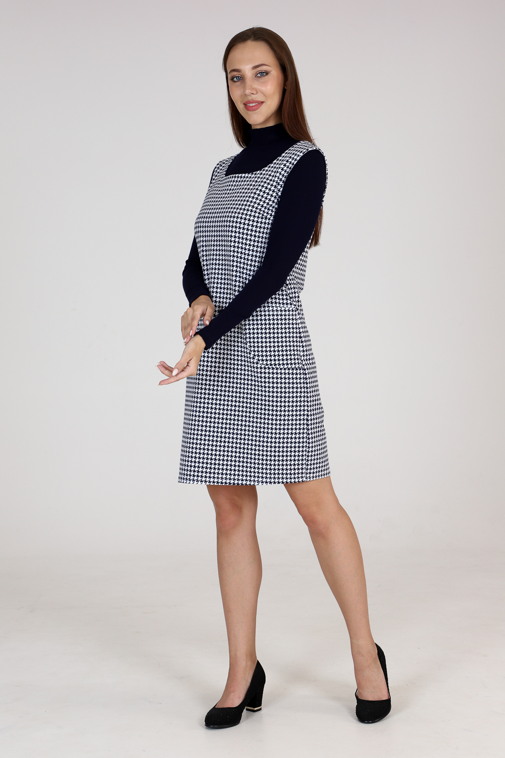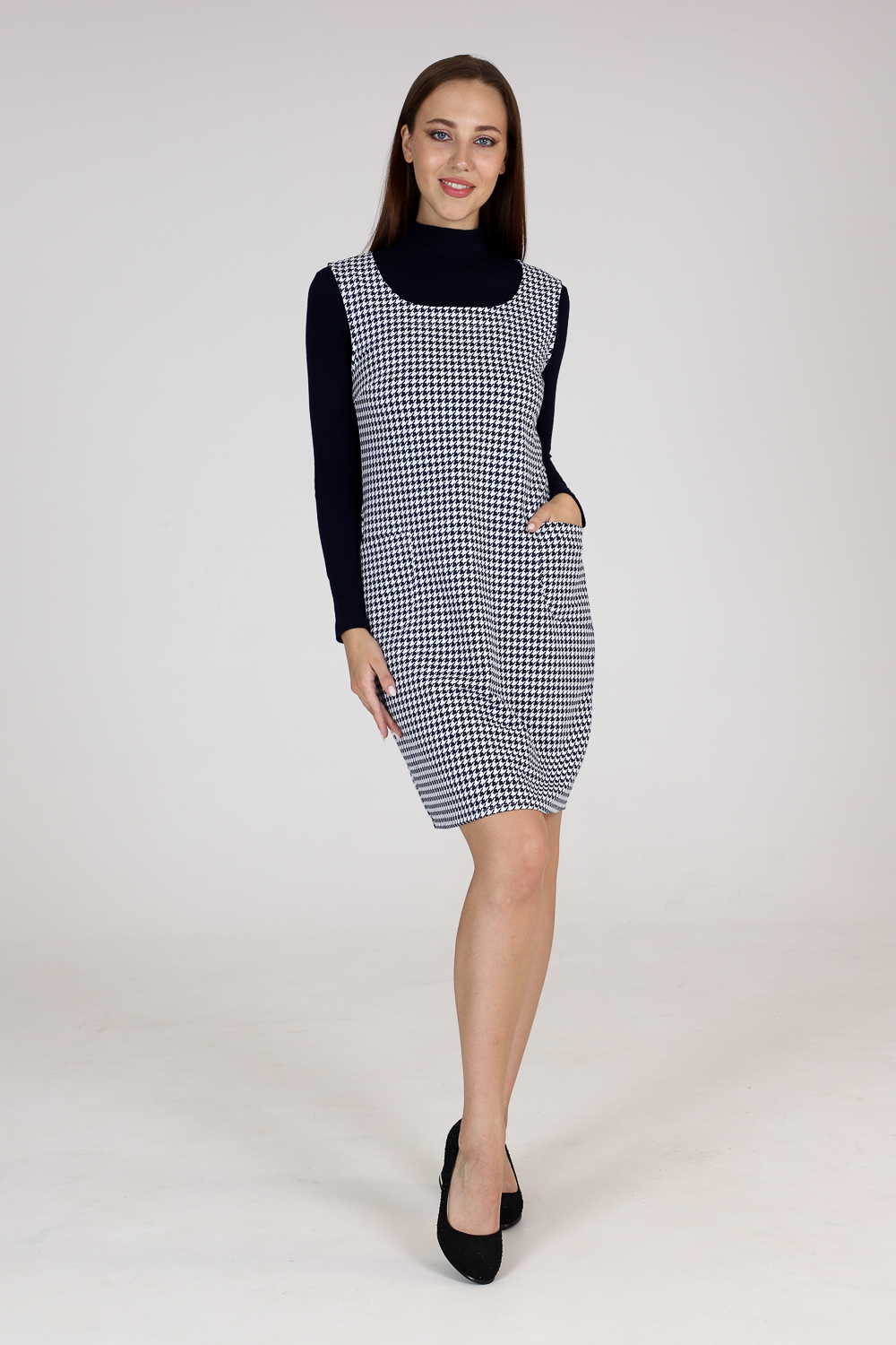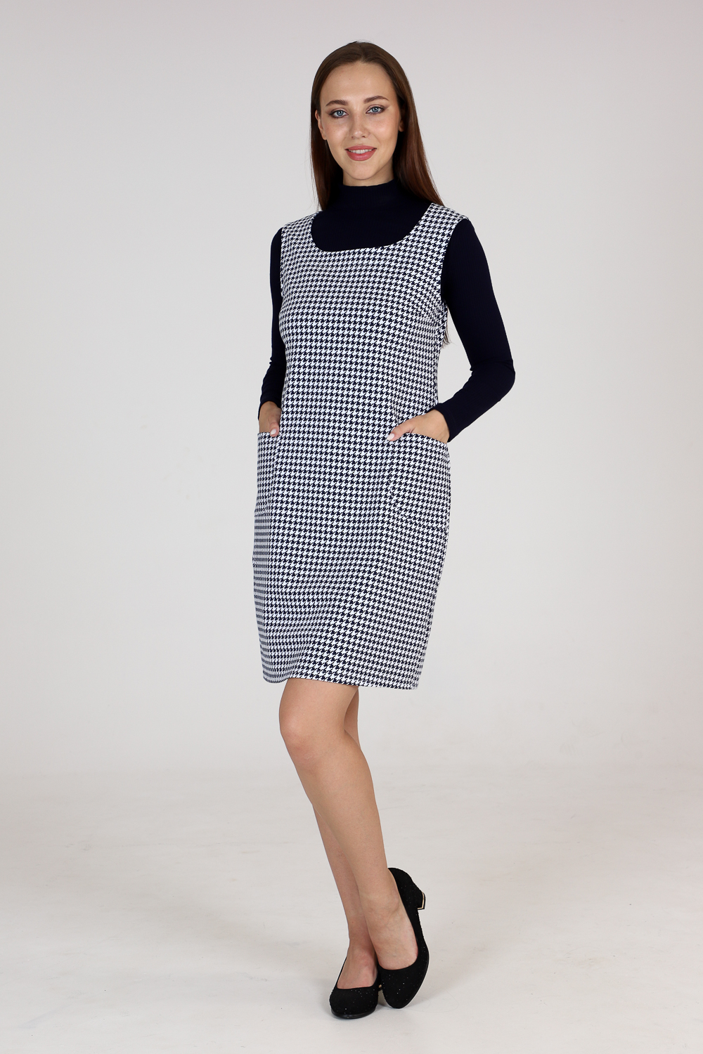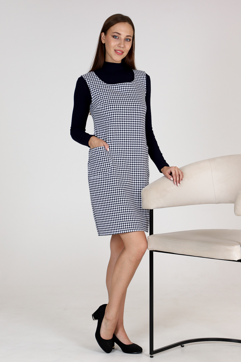 Стильный сарафан прилегающего силуэта с накладными карманами. Универсальная вещь в вашем гардеробе, наденьте сарафан с блузой или водолазкой, и ваш образ изменится. Комфортная в движении и приятная к телу ткань не мнётся и хорошо держит форму. Классические расцветки: яркие и эффектные "гусиные лапки"и благородная "ёлочка" будут соответствовать дресс-коду любой компании.