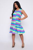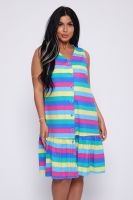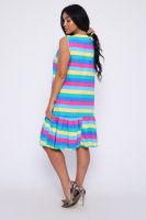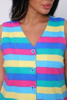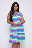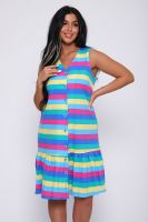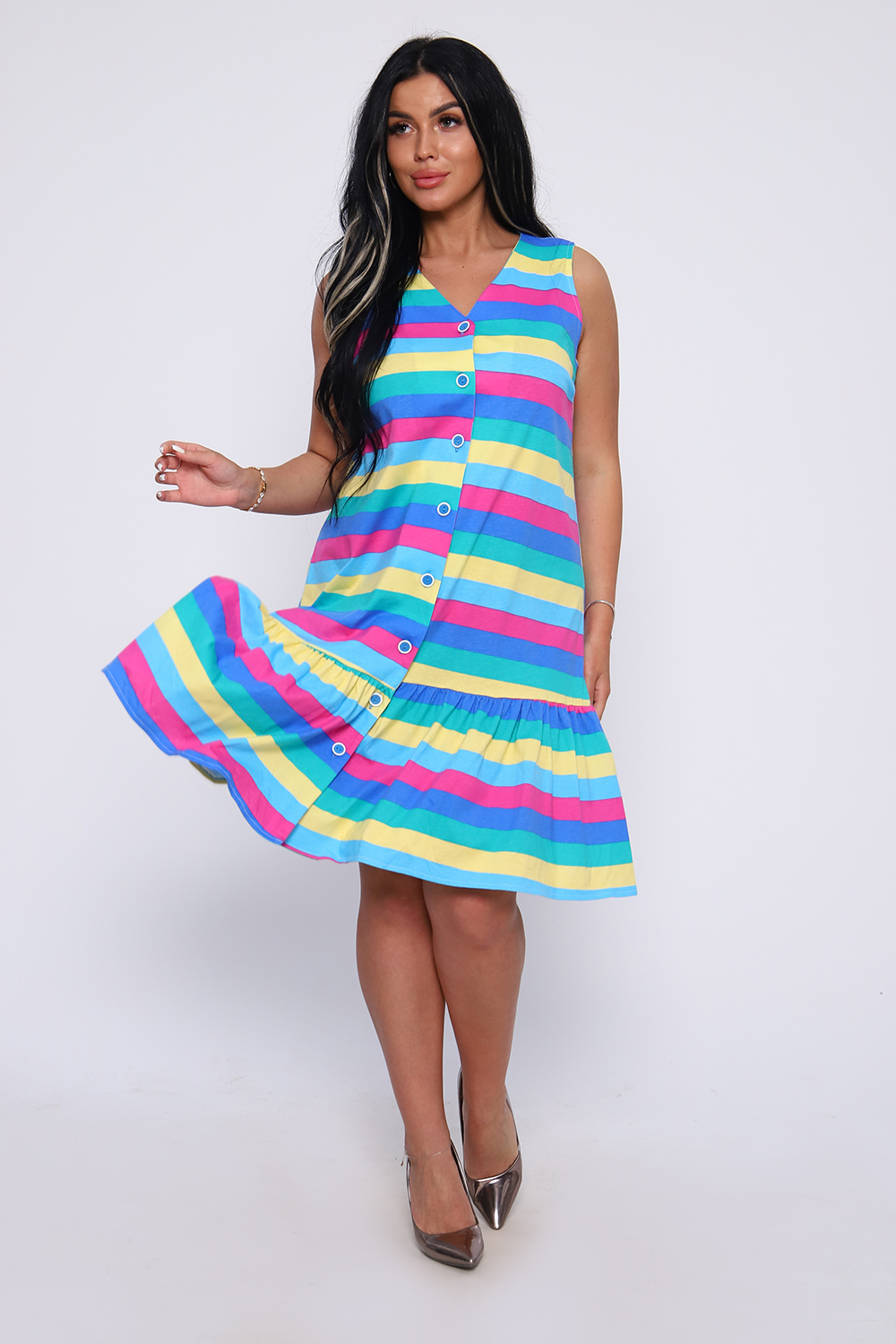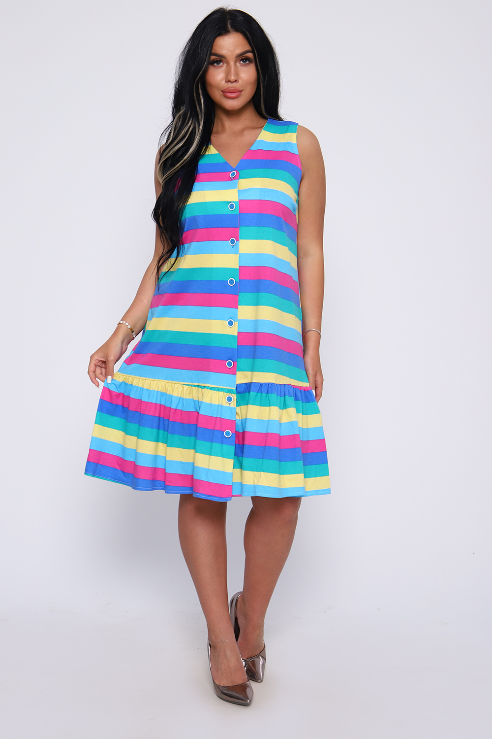 Яркий сарафан, без рукавов прямой крой, внизу кокетка - рюша, на пуговицах.