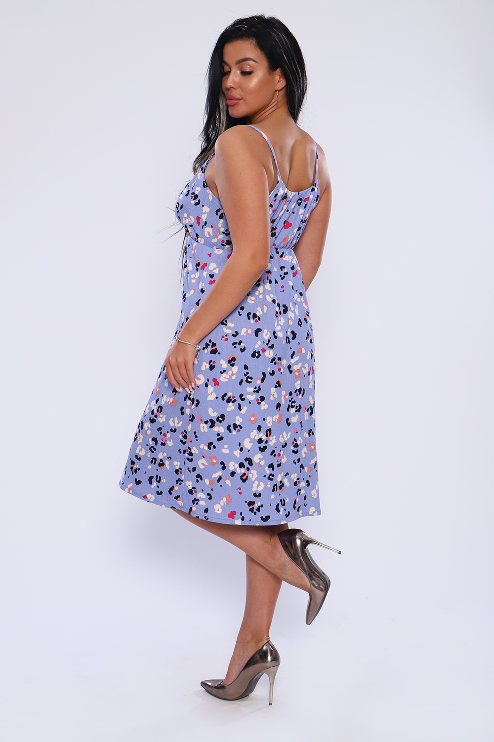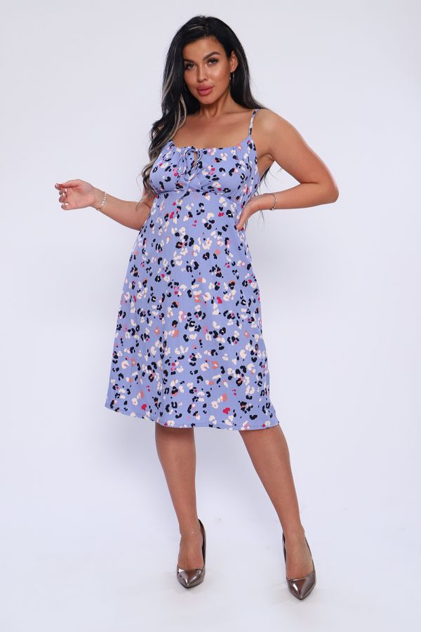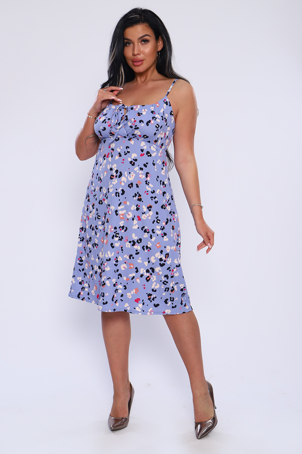 Женственный сарафан из жатой ткани на бретелях - завязках, с подрезом под грудью на резинке. Длина до колена. Отличная модель для жаркого лета.