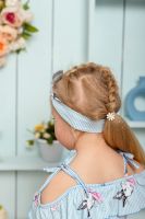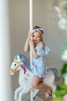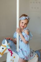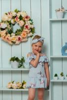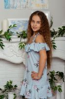 Сарафан детский летний для девочек полуприлегающего силуэта. Верх изделия оформлен пышной рюшей на тонких бретелях-завязках. По низу притачена пышная юбка в оборку. Низ рюши и юбки обработан декоративной краеобметочной строчкой.