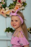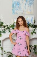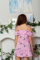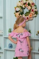 Сарафан детский летний для девочек полуприлегающего силуэта. Верх изделия оформлен пышной рюшей на тонких бретелях-завязках. По низу притачена пышная юбка в оборку. Низ рюши и юбки обработан декоративной краеобметочной строчкой.