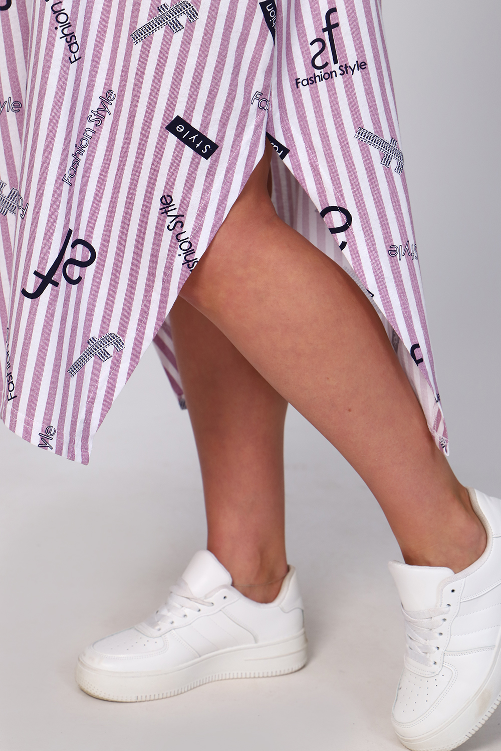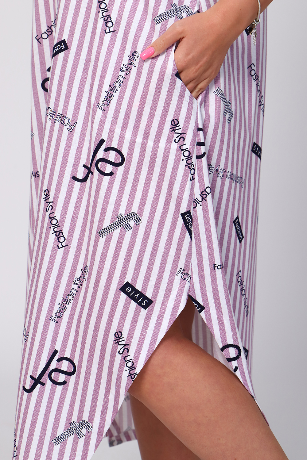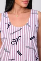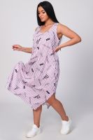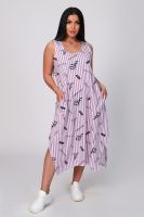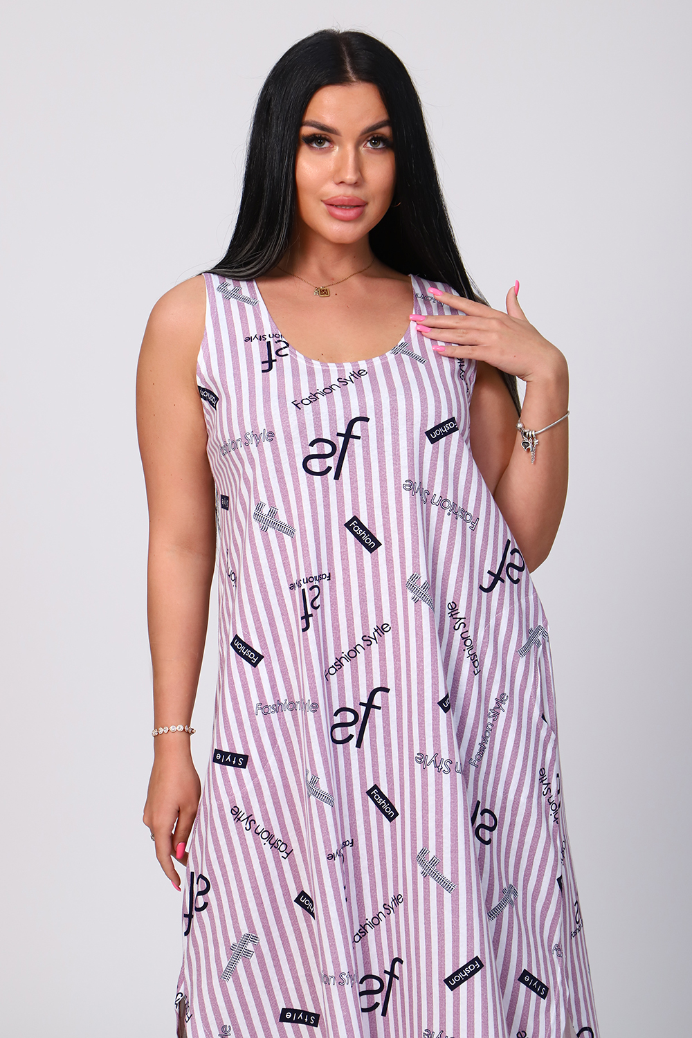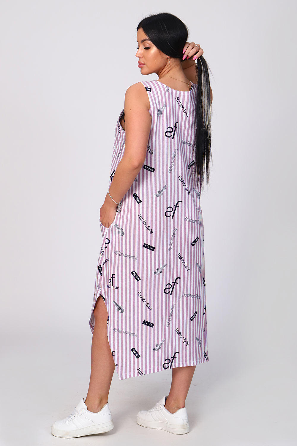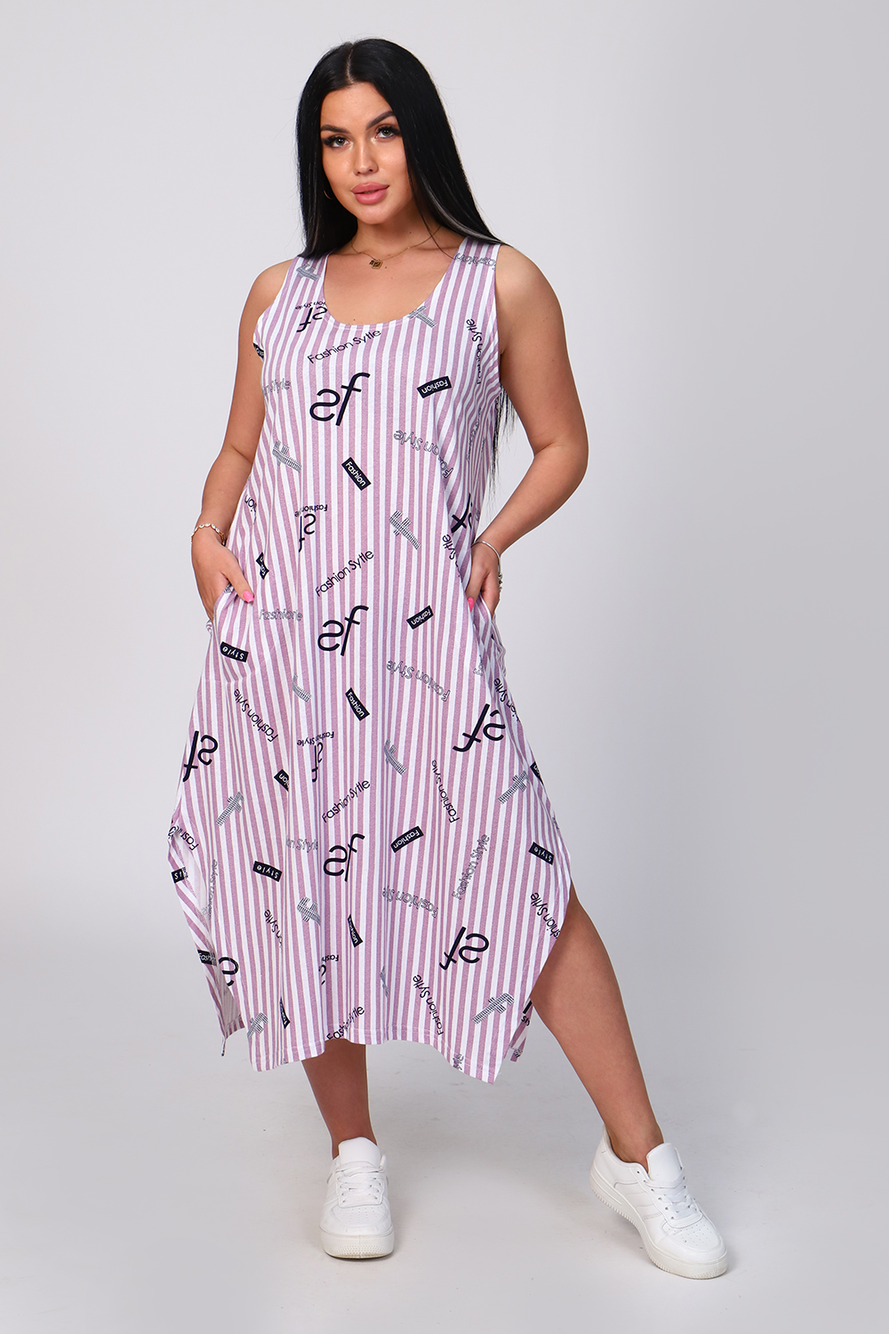 Сарафан женский в полоску, силуэт трапеция, удлиненный, без рукава, имеются накладные карманы, вырез горловины круглый, низ сарафана оформлен боковыми разрезами. Отличный вариант для повседневной носки из натурального хлопка.