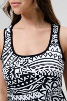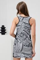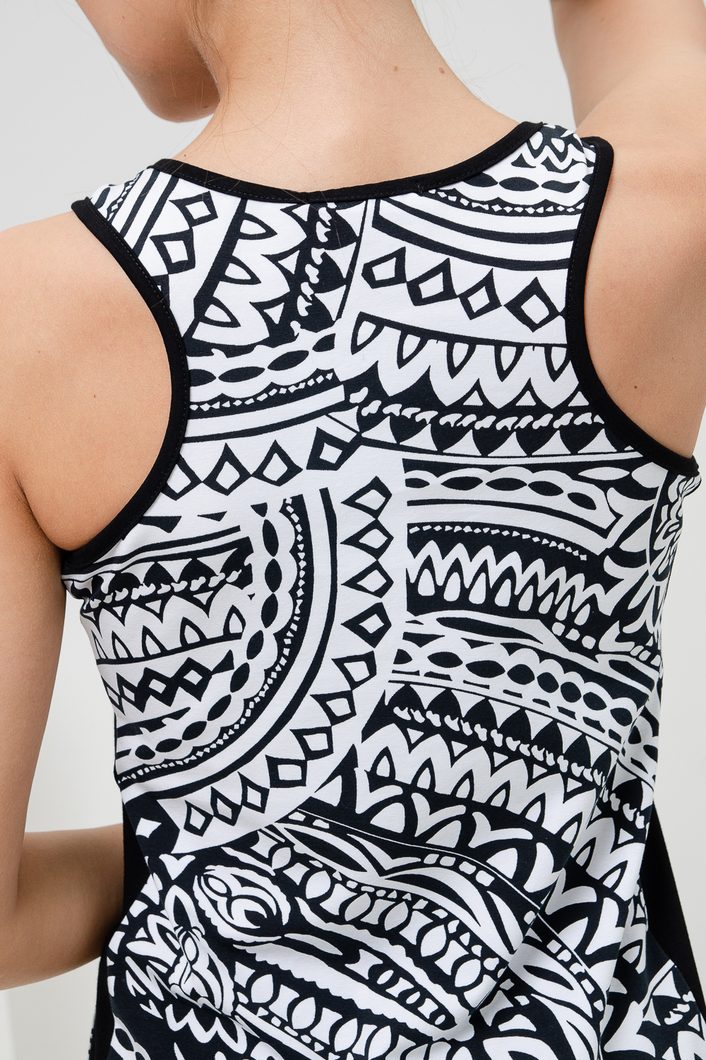 Сарафан полуприлегающего силуэта, с крадратным вырезом спереди и "борцовкой" сзади, длиной выше колена, без рукавов. Вдоль боковых швов расположены лампасы из отделочного полотна. Горловина и проймы обработаны бейкой из отделочного полотна.