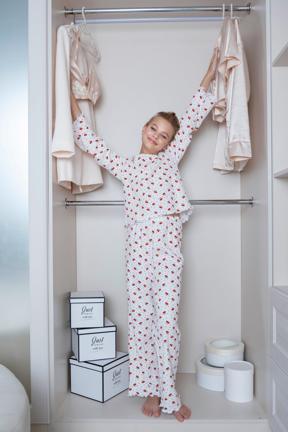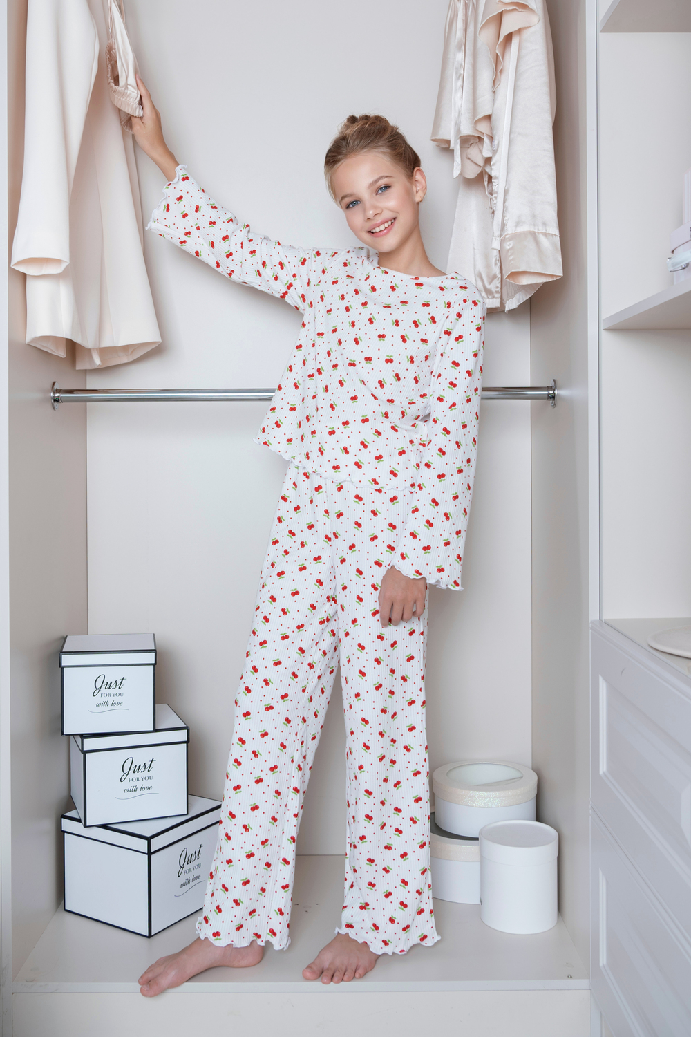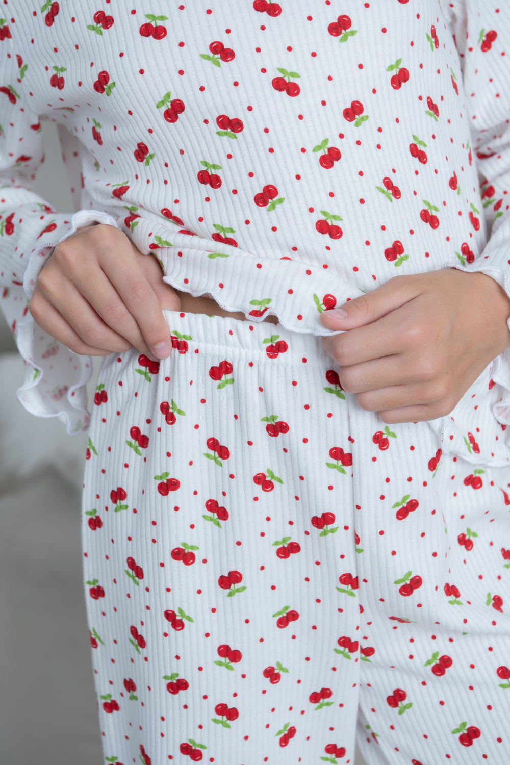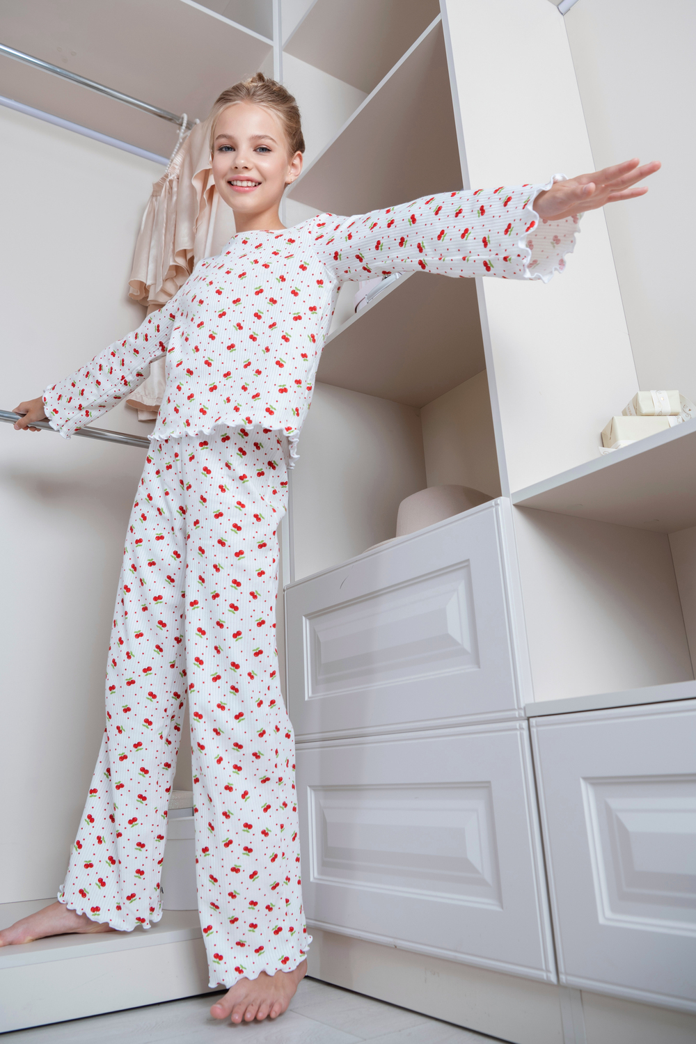 Очаровательная детская пижама из мягкого хлопкового трикотажа с принтом в яркие вишенки. Лёгкая, дышащая ткань приятна к телу и не раздражает кожу. Свободный крой и волнистая отделка придают уют и нежность. Идеальна для сна и домашних вечеров.