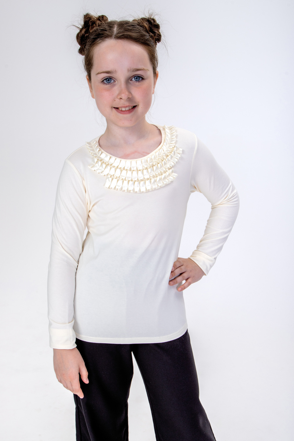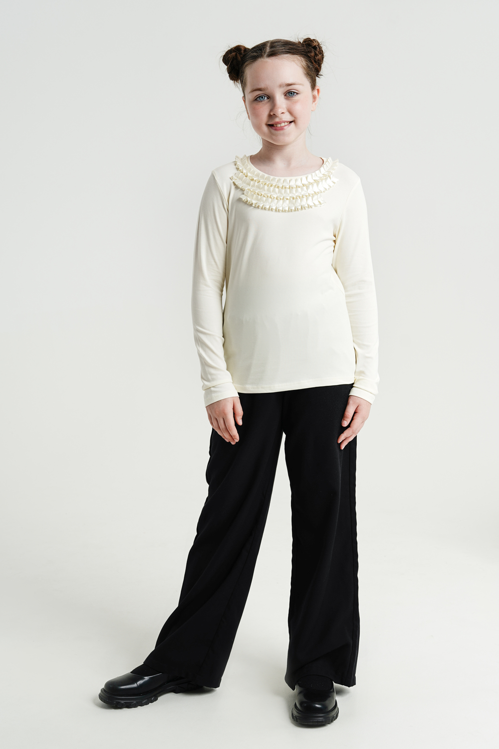 Базовая школьная блузка для девочек с длинным рукавом. Нарядная блузка станет основой как повседневного, так и праздничного образа. Декор из атласных рюш добавляет джемперу элегантности и нежности. Модель составит одинаково удачный комплект и с юбкой, и с брюками. Блузка сшита из качественного трикотажа, используемый материал не теряет форму после многократных стирок, мягкий и приятный к телу, устойчив к износу. Для сохранения первоначальных свойств изделия, важно соблюдать рекомендации по уходу.