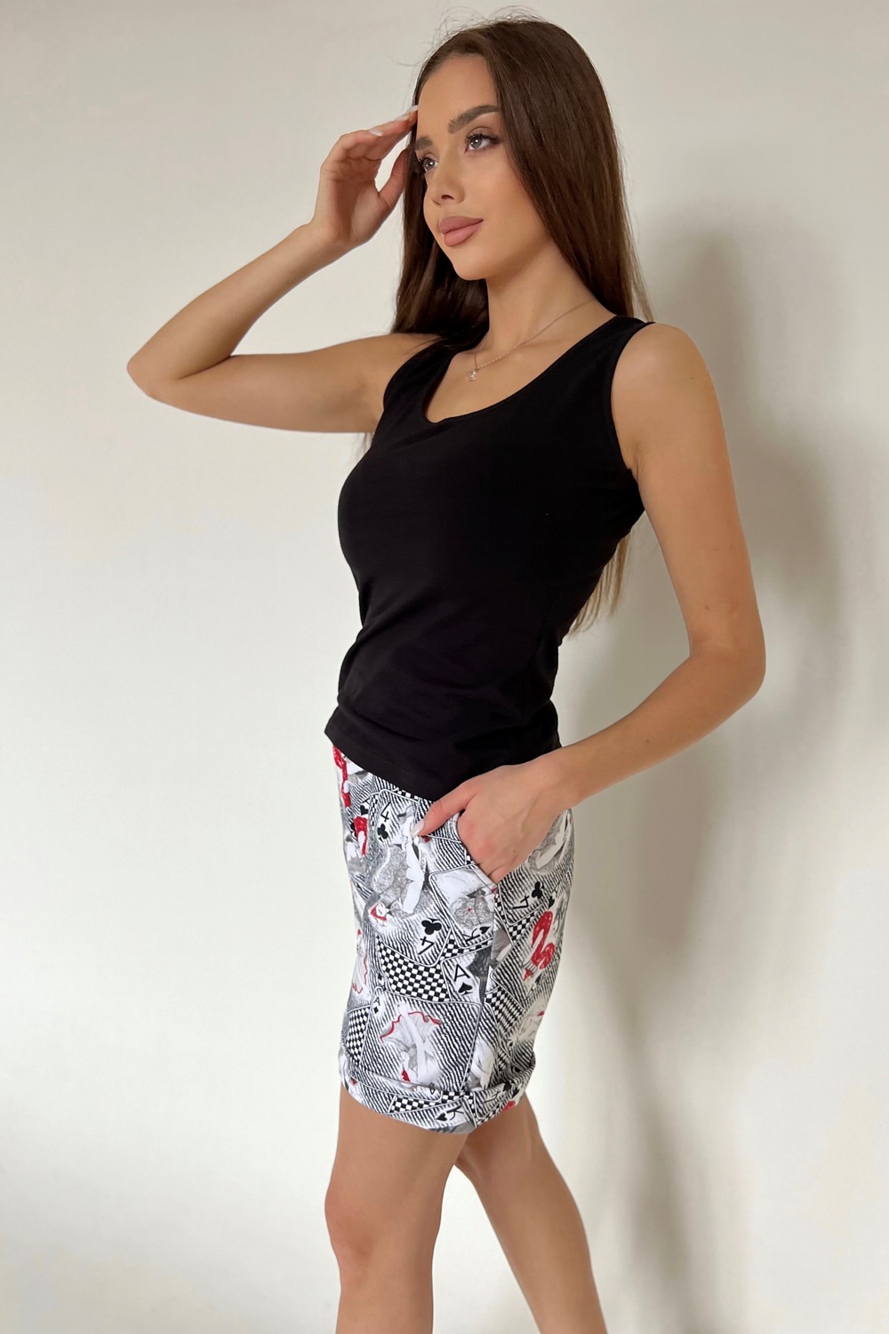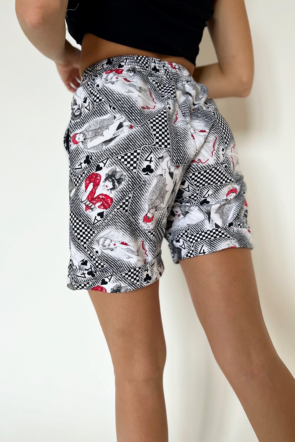 Шорты женские с карманами в боковых швах, по низу отвороты.