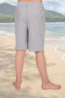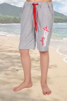 Шорты из футера с лайкрой для мальчиков. Принт в виде кроссовка и надписей, пояс со шнурком на резинке, боковые карманы, длина приблизительно до коленей. Две расцветки — серая и синяя. Размеры от 30 до 40.