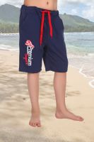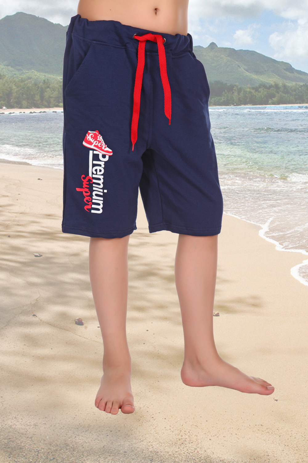 Шорты из футера с лайкрой для мальчиков. Принт в виде кроссовка и надписей, пояс со шнурком на резинке, боковые карманы, длина приблизительно до коленей. Две расцветки — серая и синяя. Размеры от 30 до 40.