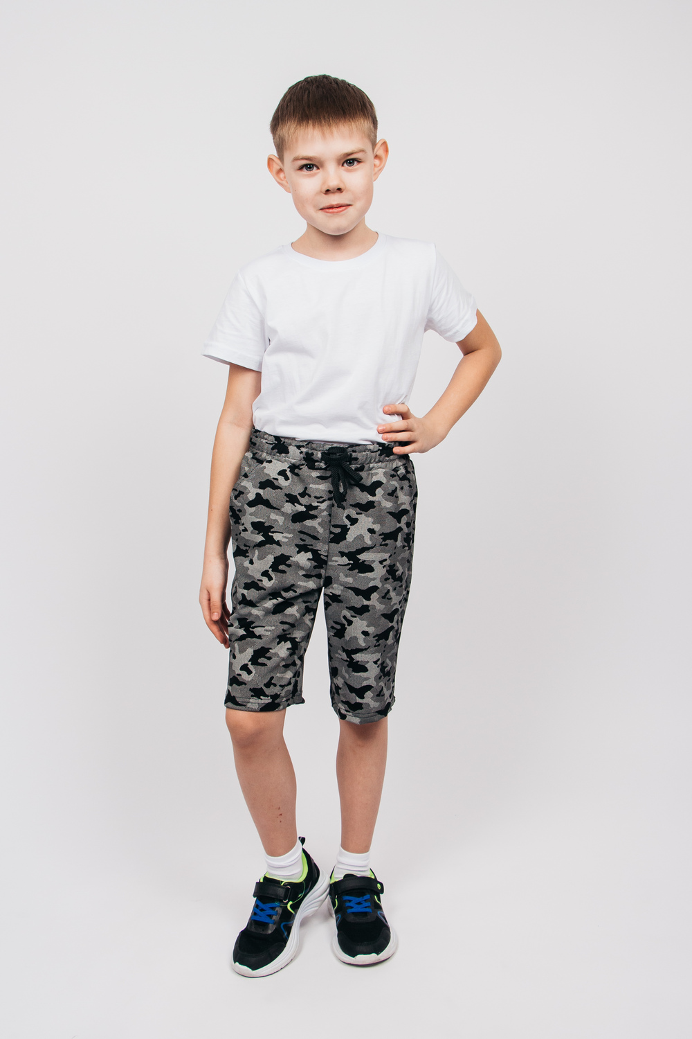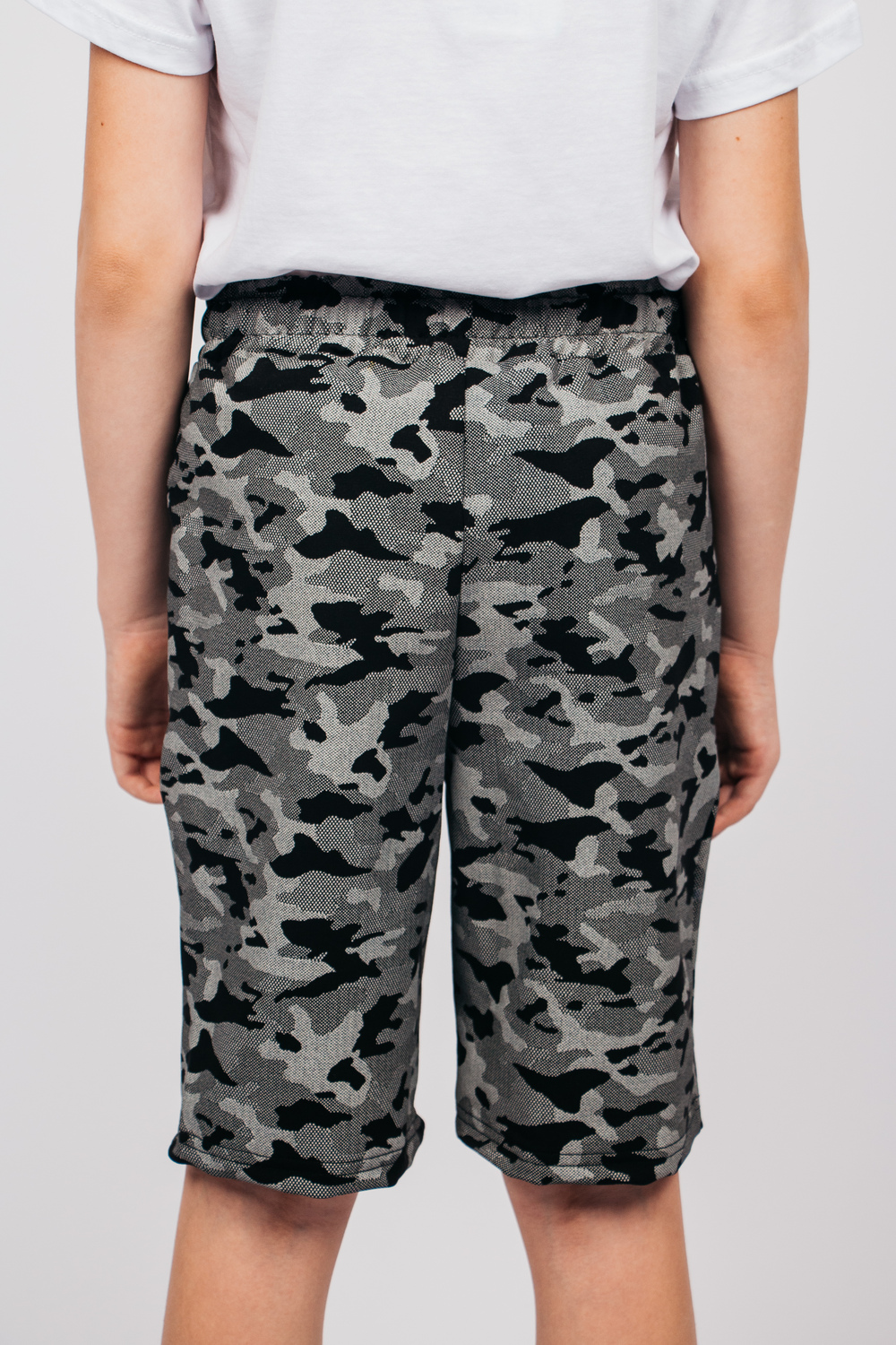 Шорты детские с модным в этом сезоне камуфляжным принтом подойдут любому ребенку, который любит собирать модные и удобные образы. Пояс отрезной, с резинкой и шнуром внутри. Шорты с карманами на передней половинке с отрезным бочком. Изготовлены из петельчатого футера с добавлением полиэстера и эластана.