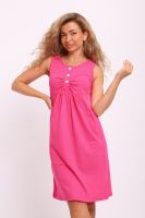 Женская сорочка без рукавов. Данная модель выполнена из трикотажного полотна кулирка (хлопок 100%). Полочка отрезная под грудью, шов фигурный. Верхняя часть полочки (лиф) имеет сборку по центру груди и планку на пуговках. Верх нижней части полочки по центру также со сборкой. Горловина и пройма изделия обработаны окантовкой из основной ткани. Отлично подходит для беременных и кормящих мам.