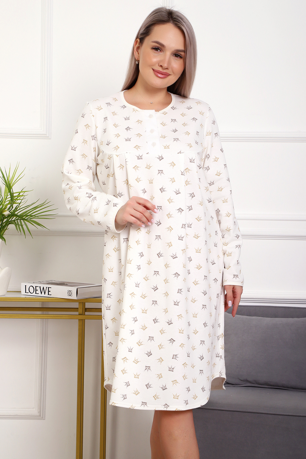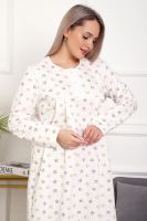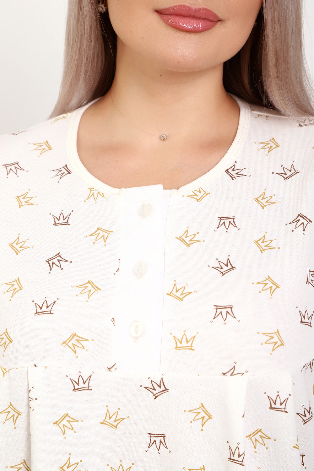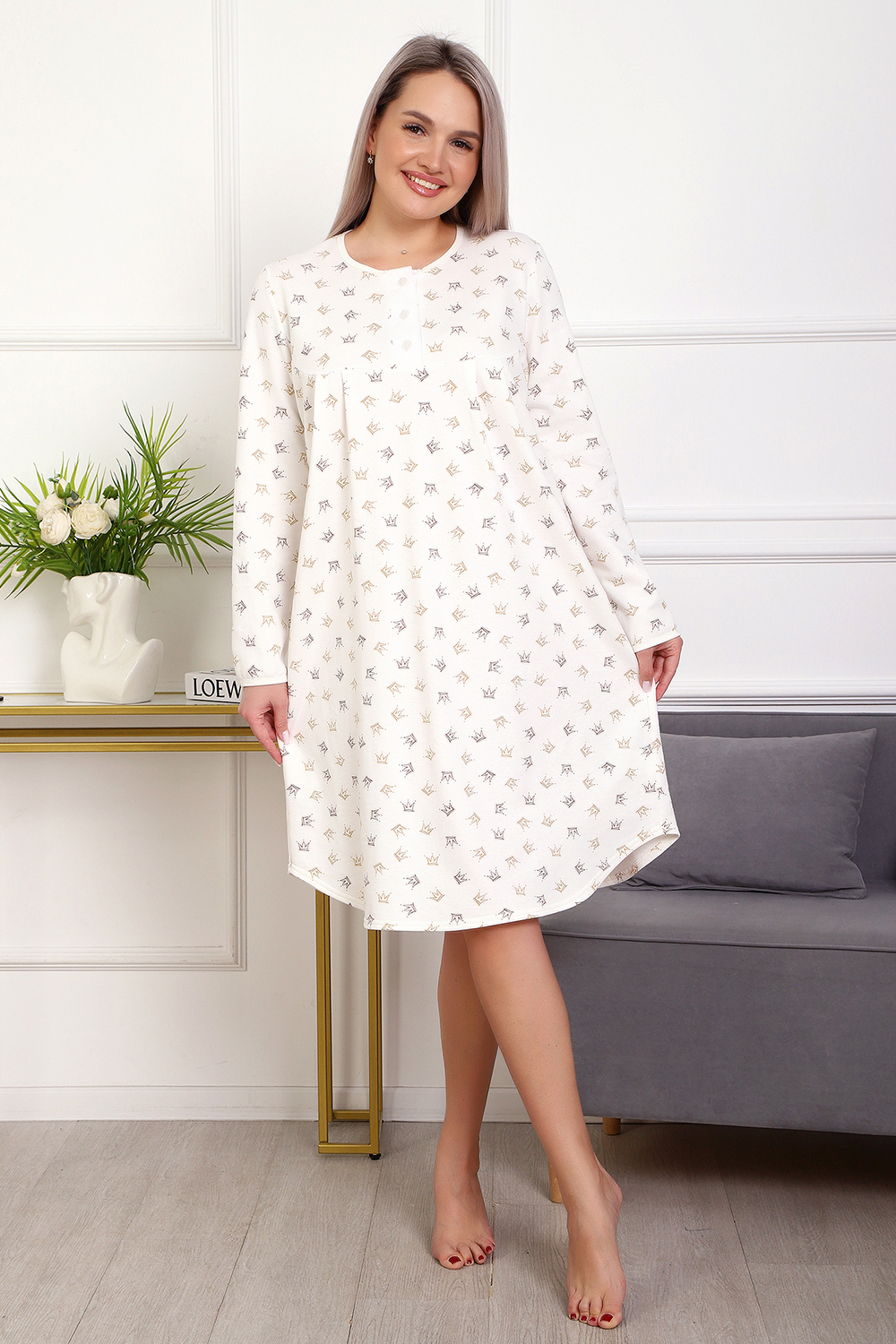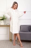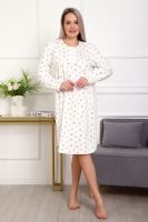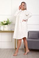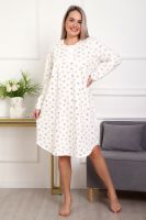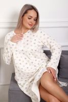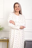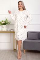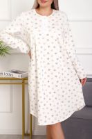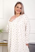 Теплая и приятная к телу сорочка из футера с начесом. Длинный рукав, кокетка с планкой на пуговицах. Фасон достаточно свободный за счет защипов на полочке. Низ изделия фигурный, подшит на плоскошовной машине. Горловина и рукава обработаны окантовкой.