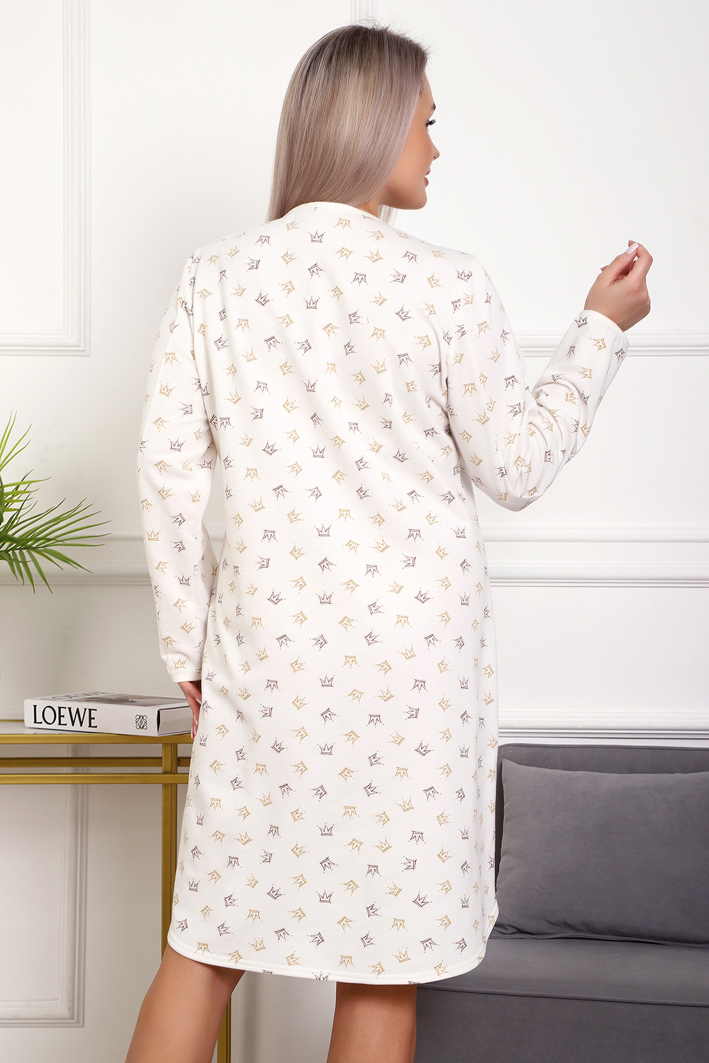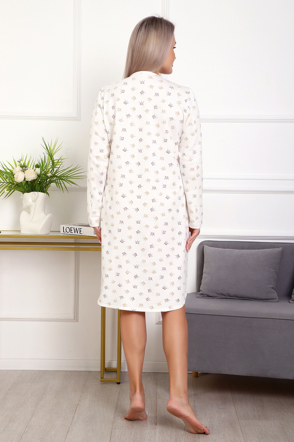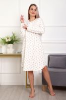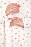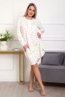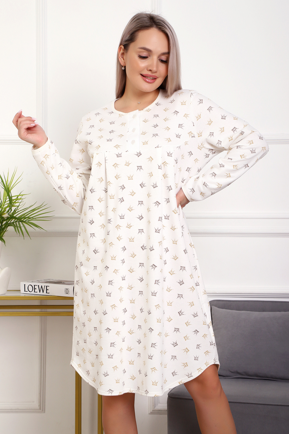 Теплая и приятная к телу сорочка из футера с начесом. Длинный рукав, кокетка с планкой на пуговицах. Фасон достаточно свободный за счет защипов на полочке. Низ изделия фигурный, подшит на плоскошовной машине. Горловина и рукава обработаны окантовкой.