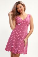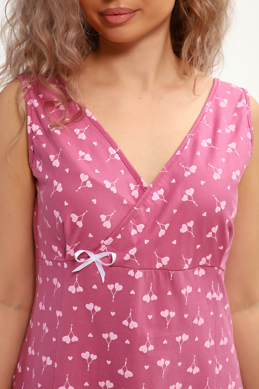 Сорочка с V образным вырезом. Полочка отрезная под грудью. Юбка с рельефами. Нашиты бантики. Подходит для беременных.