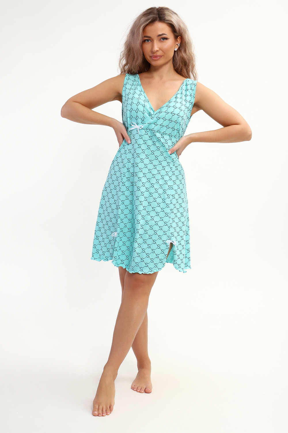 Сорочка с V образным вырезом. Полочка отрезная под грудью. Юбка с рельефами. Нашиты бантики. Подходит для беременных.