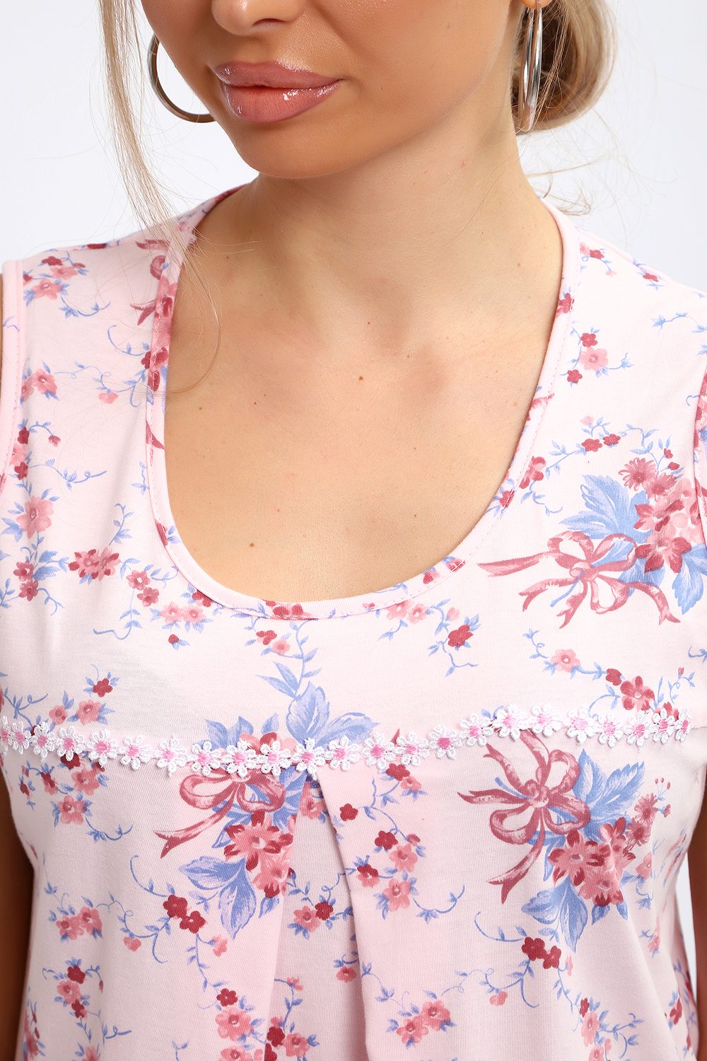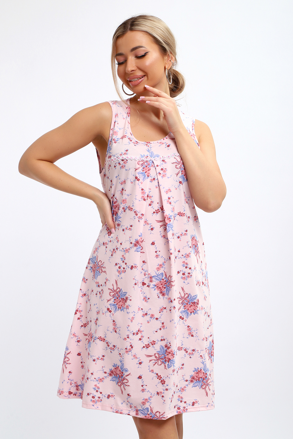 Сорочка свободного покроя маечного типа с кокеткой без рукава. По кокетке нашиты декоративные ромашки. Под кокеткой на юбке встречная складка. Подходит для беременных.