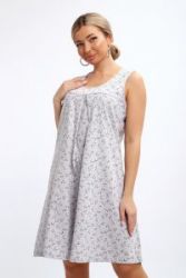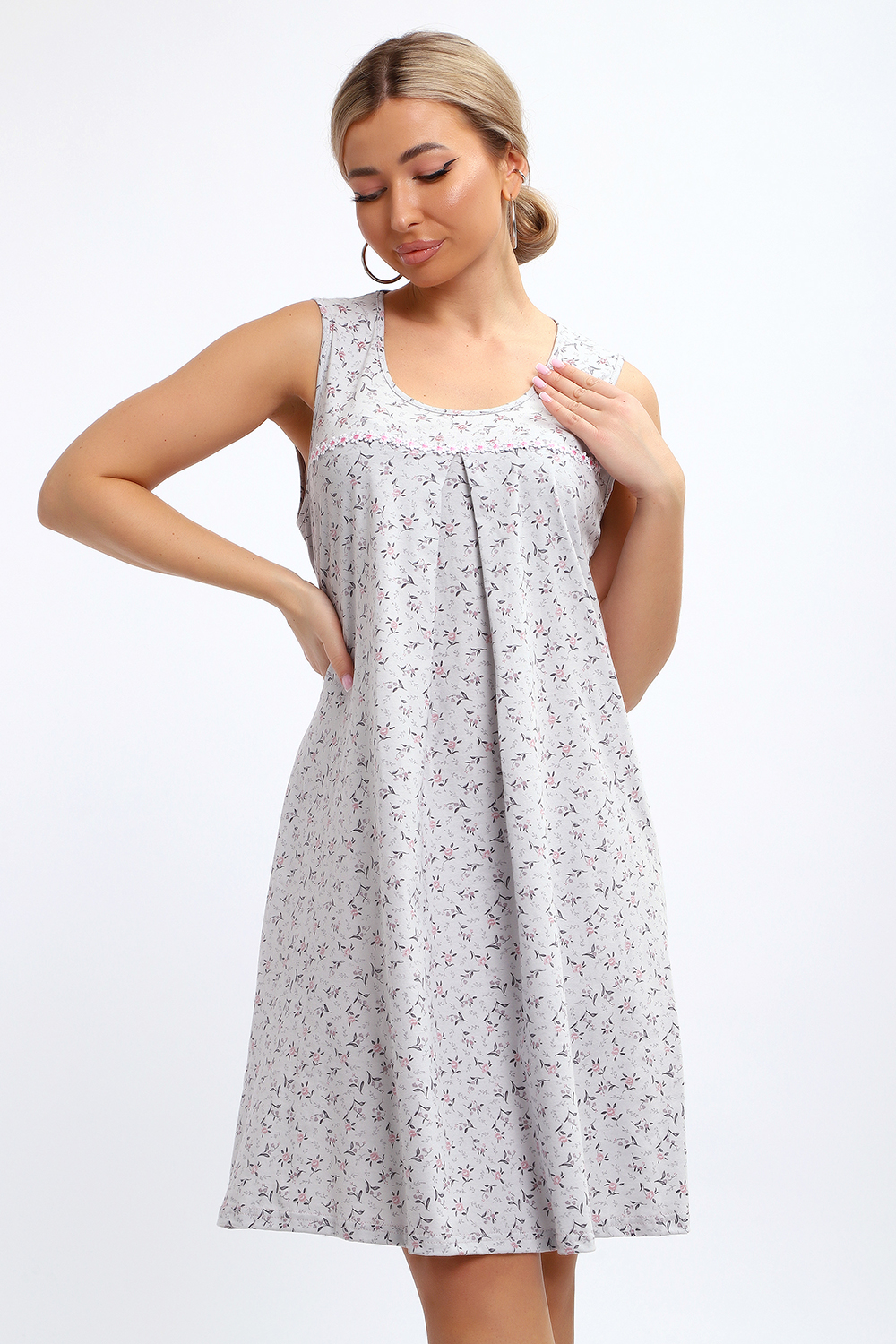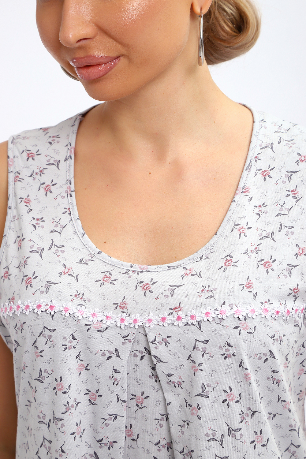 Сорочка свободного покроя маечного фасона без рукава. Юбка под кокеткой со встречной складкой. По кокетке нашиты декоративные ромашки. Подходит для беременных.