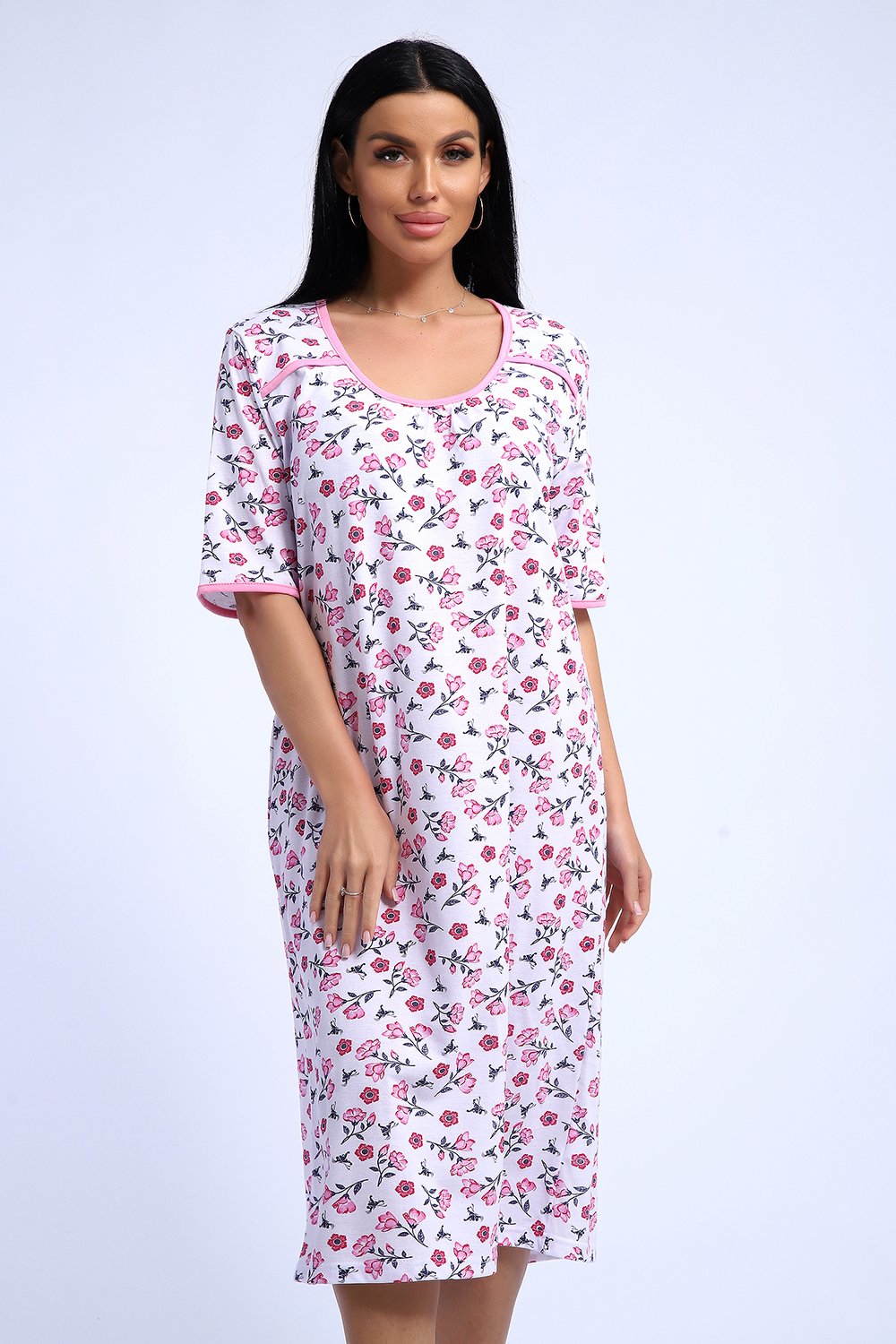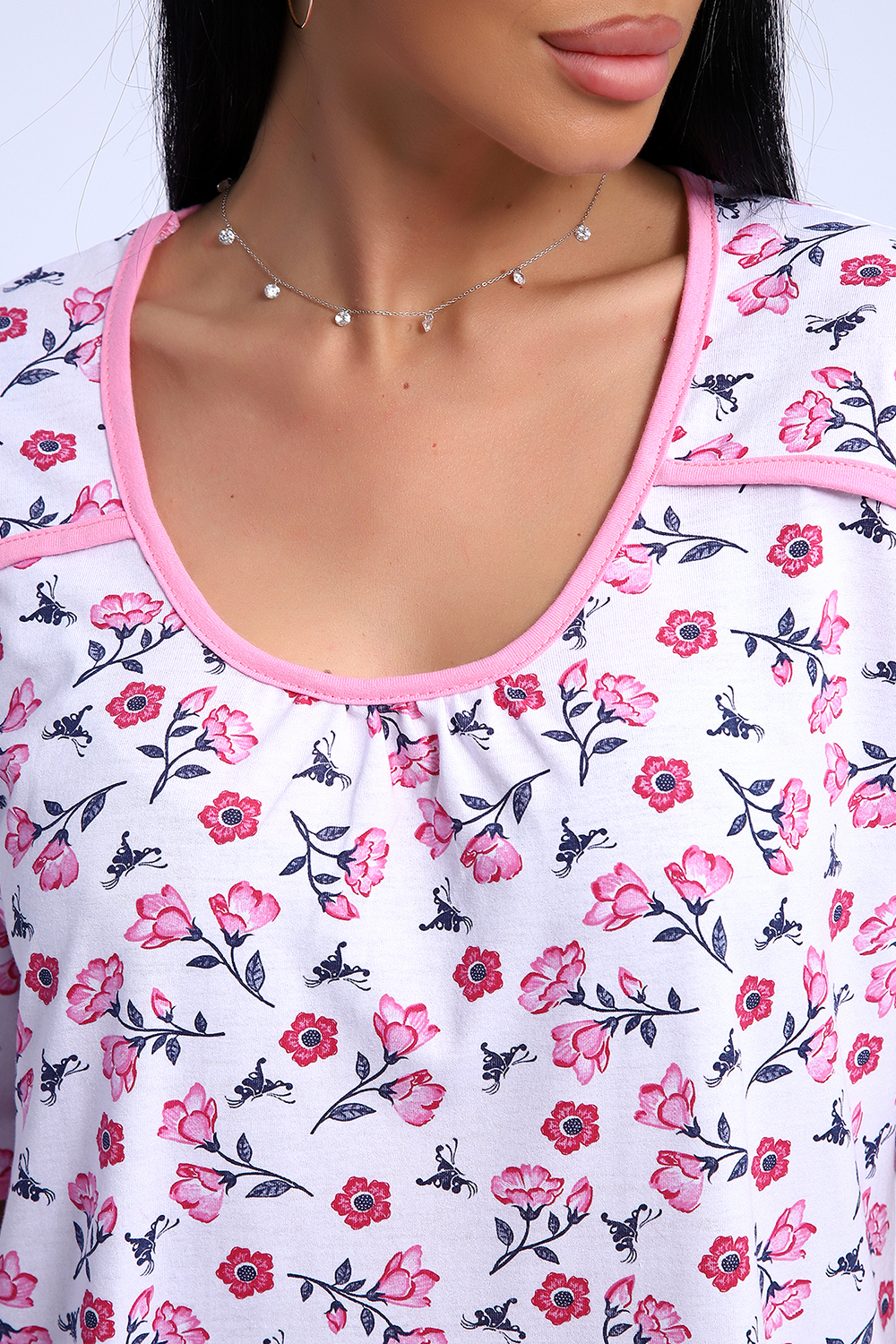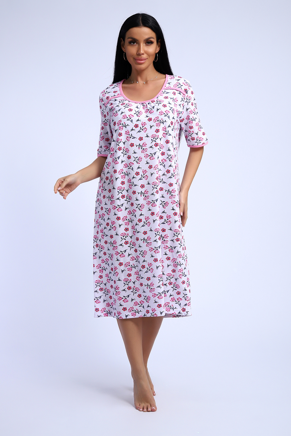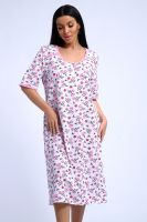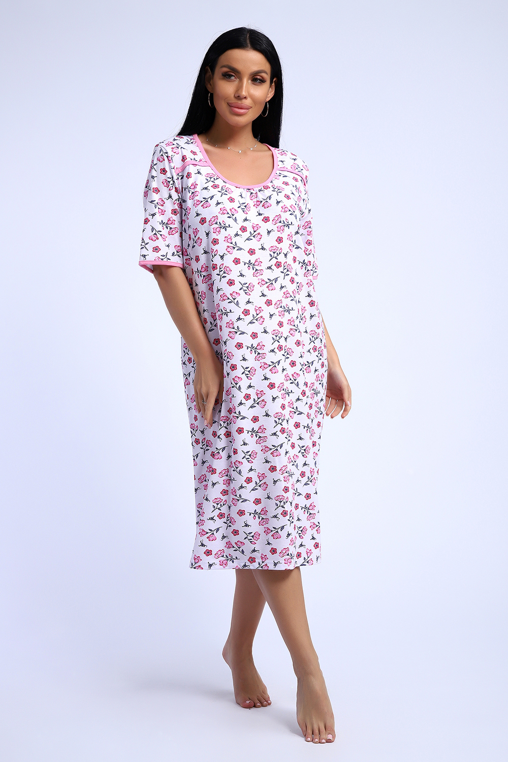 Сорочка из белоземельной хлопковой кулирки с нежным цветочным рисунком, рукава до локтя.