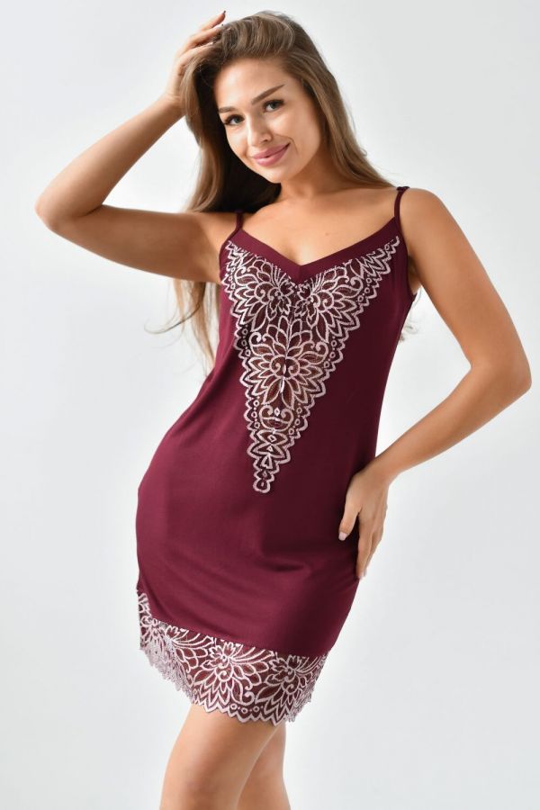 Сорочка женская на бретелях полуприлегающего силуэта. Длина чуть выше колена, полочка оформлена декоративным элементом - кружево. Ворсовая поверхность сорочки переливается во время движения, ткань не мнется и не растягивается. Мягкий бархат в сочетании с романтичным кружевом создаст женственный и привлекательный образ. Можно составить комплект с халатом 51652, товары продаются отдельно.