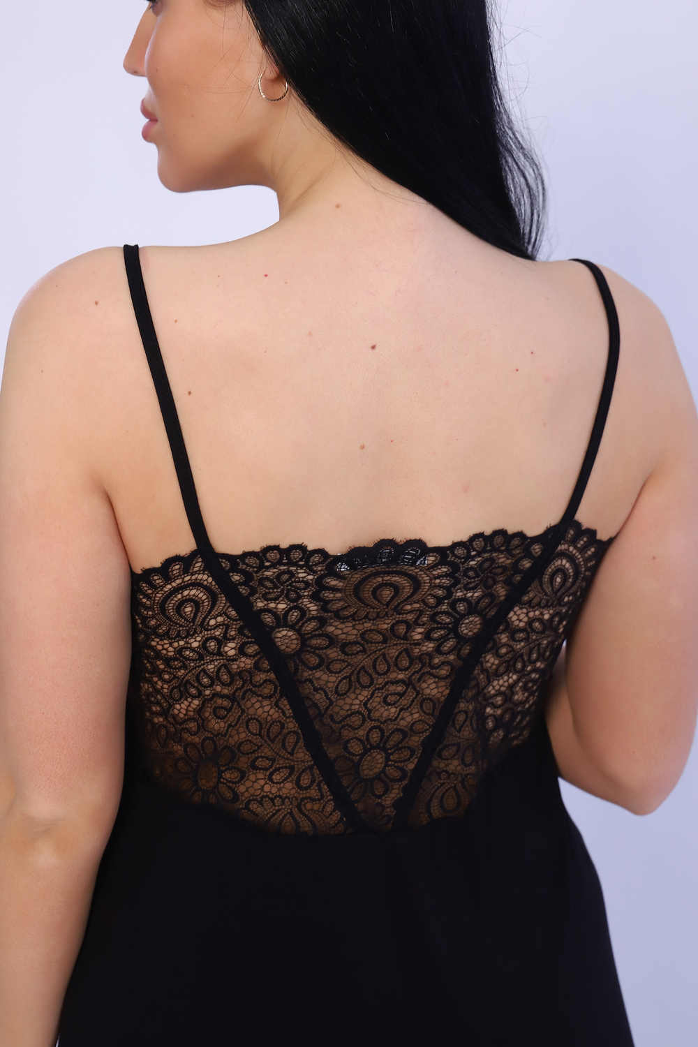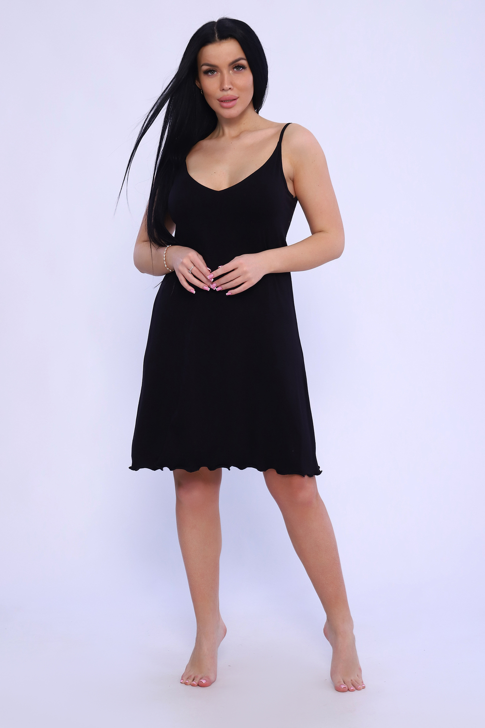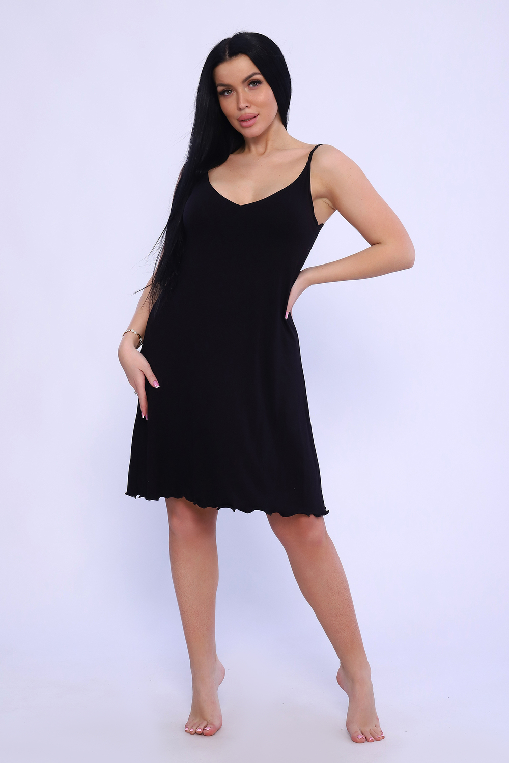 Сорочка женская на узких бретелях с широким стрейч-кружевом на спинке. Модель приталенного силуэта, на груди фигурный V-образный вырез, удобный двойной лиф. Сорочка-миди женственная, стильная, из приятной к телу вискозы. Ткань отличается мягкостью и легкостью, а благодаря наличию в составе лайкры обладает способностью растягиваться и возвращаться к первоначальному размеру. Длина изделия в таблице измерений указана от наивысшей точки плеча.