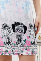 Сорочка на бретелях полуприлегающего силуэта, длиной выше колена. На горловине полочки расположены декоративные элементы. Горловина, бретели и декоративные элементы на полочке обработаны бейкой из отделочного полотна.