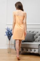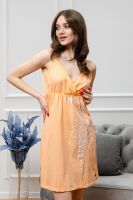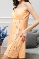 Сорочка на бретелях, полуприлегающего силуэта, длиной выше колена. Полочка с кокетками, под грудью собрана на резинку. В нижней части боковых швов обработаны разрезы. Проймы, бретели и кокетки полочки обработаны бейкой из основного полотна.