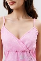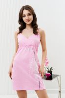 Сорочка на бретелях, полуприлегающего силуэта, длиной выше колена. Полочка с кокетками, под грудью собрана на резинку. В нижней части боковых швов обработаны разрезы. Проймы, бретели и кокетки полочки обработаны бейкой из основного полотна.