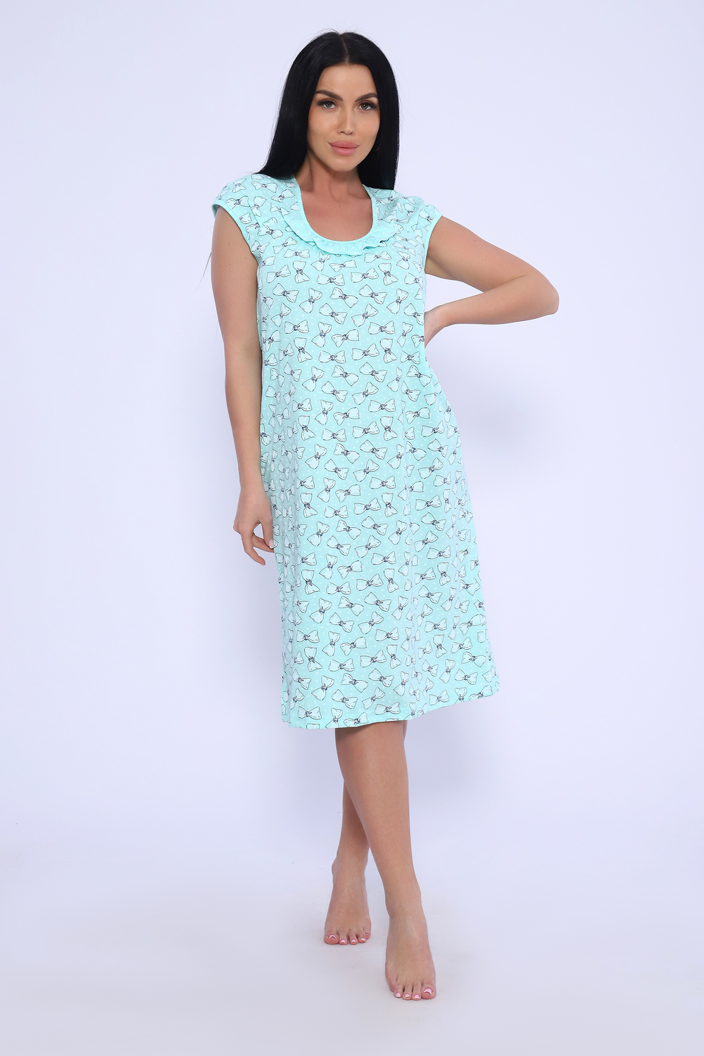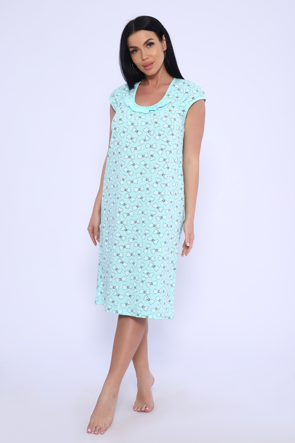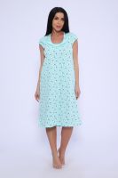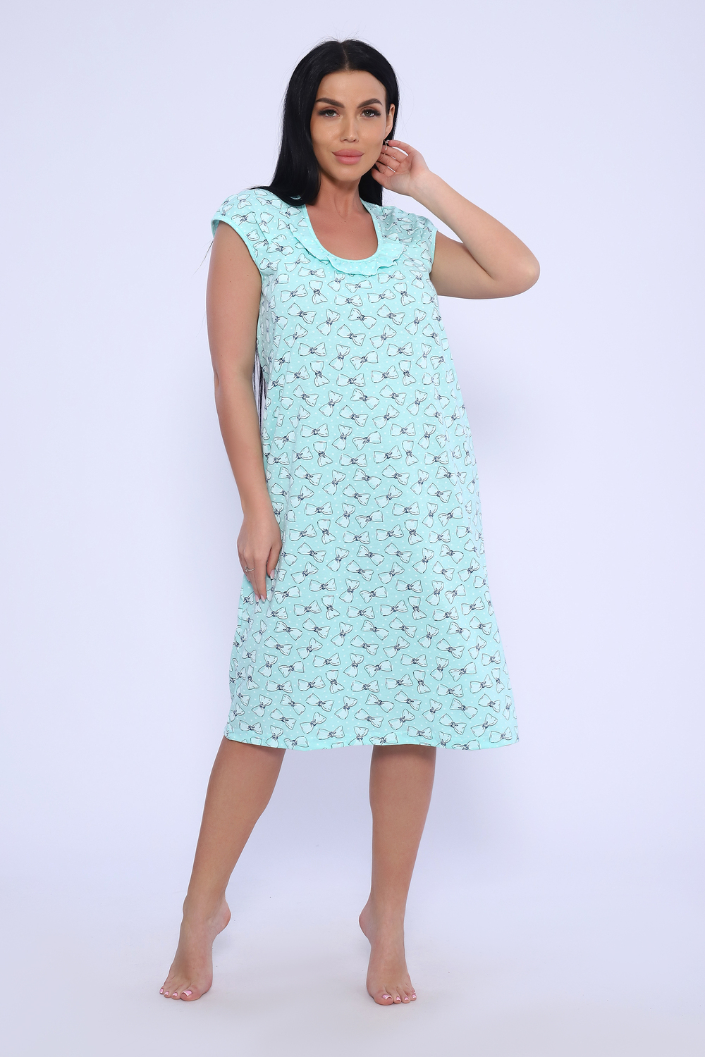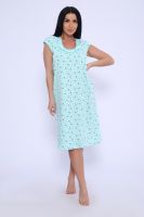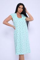 Женская сорочка из кулирки. Рукава очень короткие, окантовка, цветочный дизайн, две расцветки — розовая и шоколадная, общая длина приблизительно до коленей. Размеры от 44 до 62.