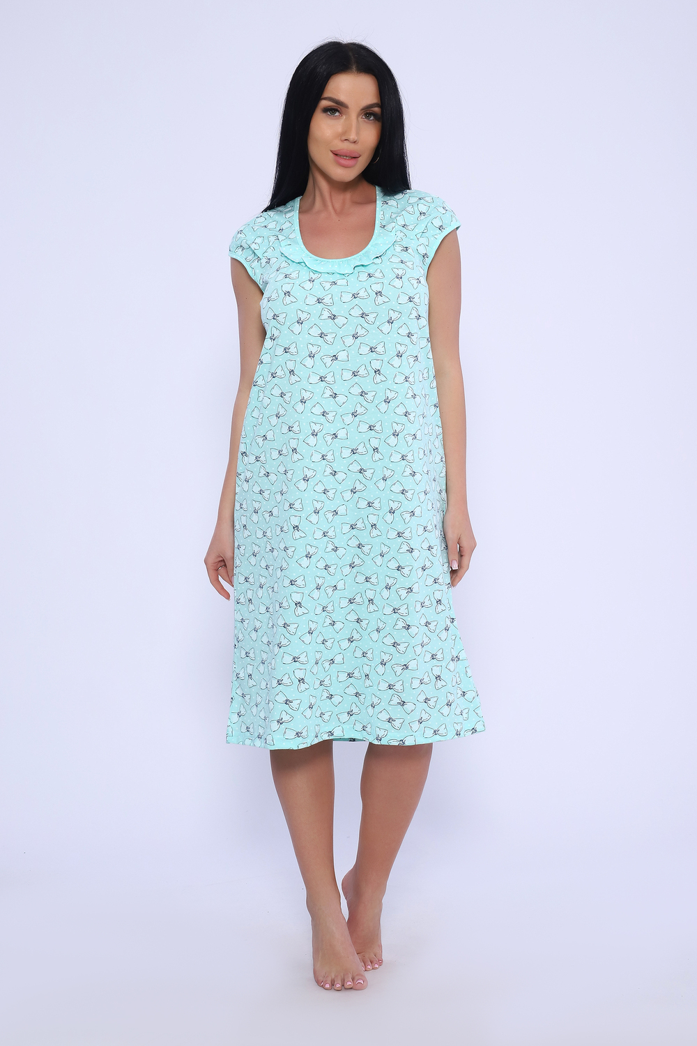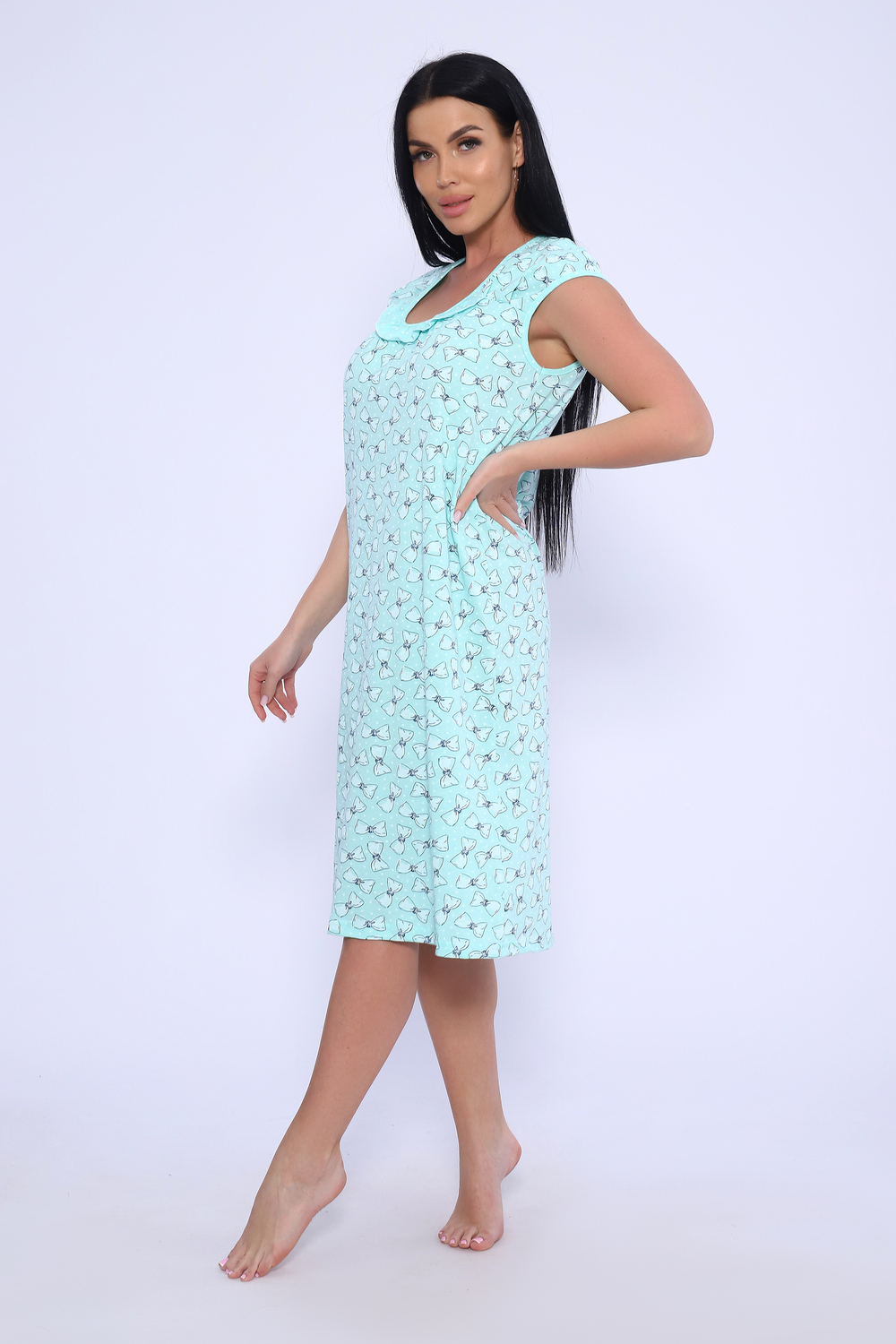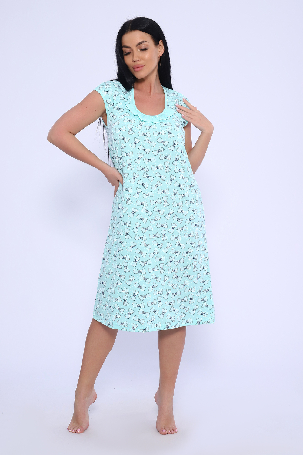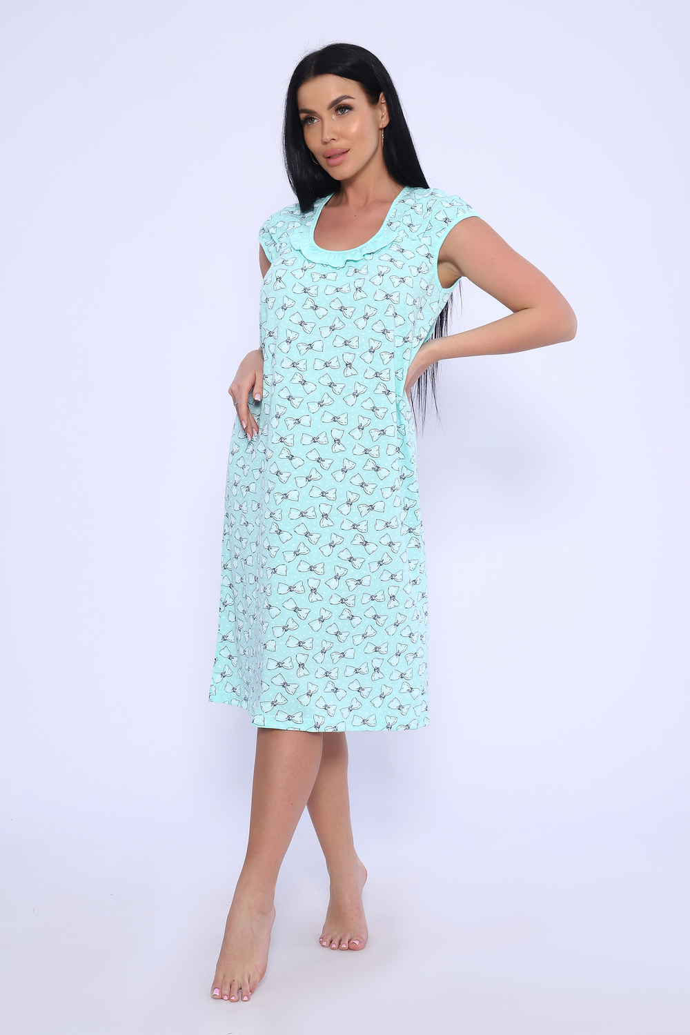 Женская сорочка из кулирки. Рукава очень короткие, окантовка, цветочный дизайн, две расцветки — розовая и шоколадная, общая длина приблизительно до коленей. Размеры от 44 до 62.