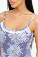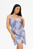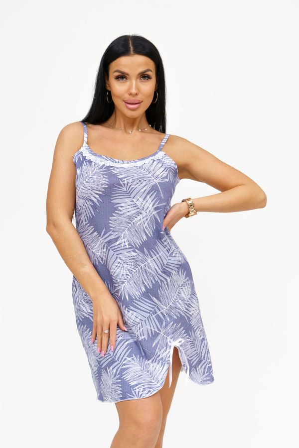 Сорочка женская на бретелях. Срез горловины украшен ажурным кружевом, по низу передней части неглубокий вырез с декоративным бантиком.