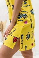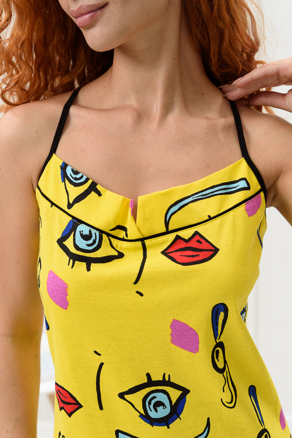 Сорочка на бретелях полуприлегающего силуэта, с разрезами в нижней части боковых швов, длиной выше колена. На полочке вверху обработан фигурный вырез. Проймы и бретели обработаны бейкой из отделочного полотна.