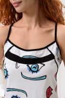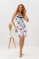 Сорочка на бретелях полуприлегающего силуэта, с разрезами в нижней части боковых швов, длиной выше колена. Полочка вверху с фигурными кокетками и вставкой из отделочного полотна. Проймы и бретели обработаны бейкой из отделочного полотна.