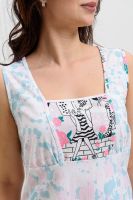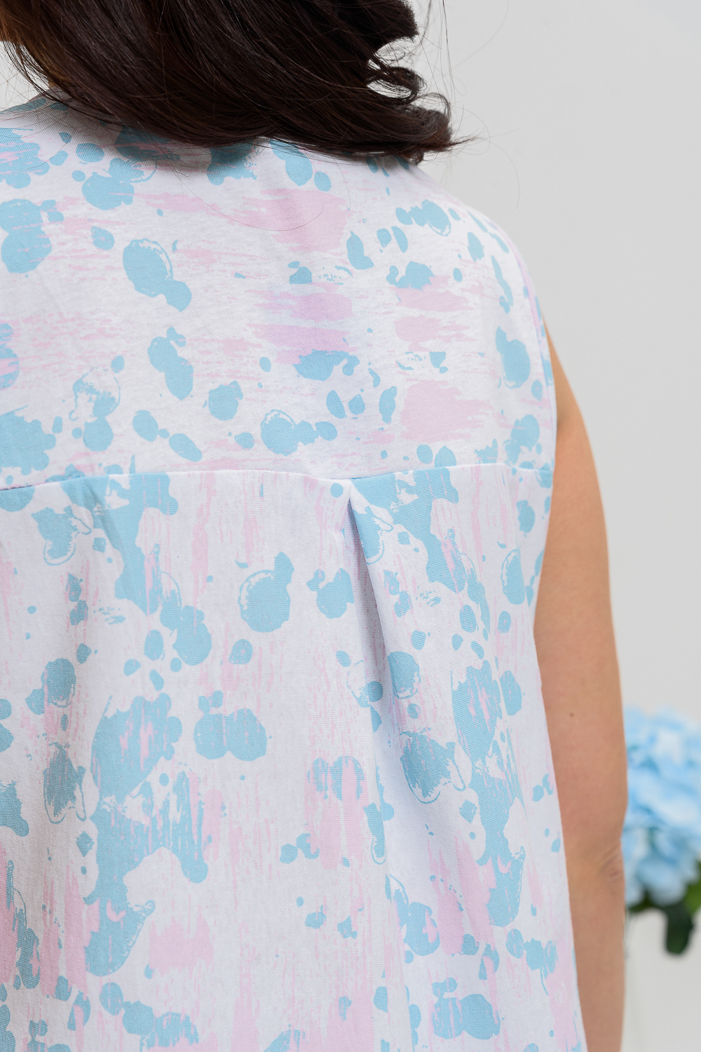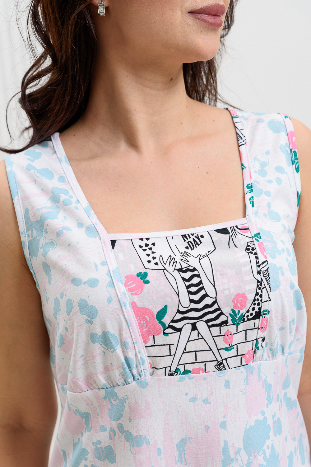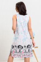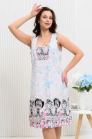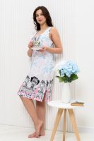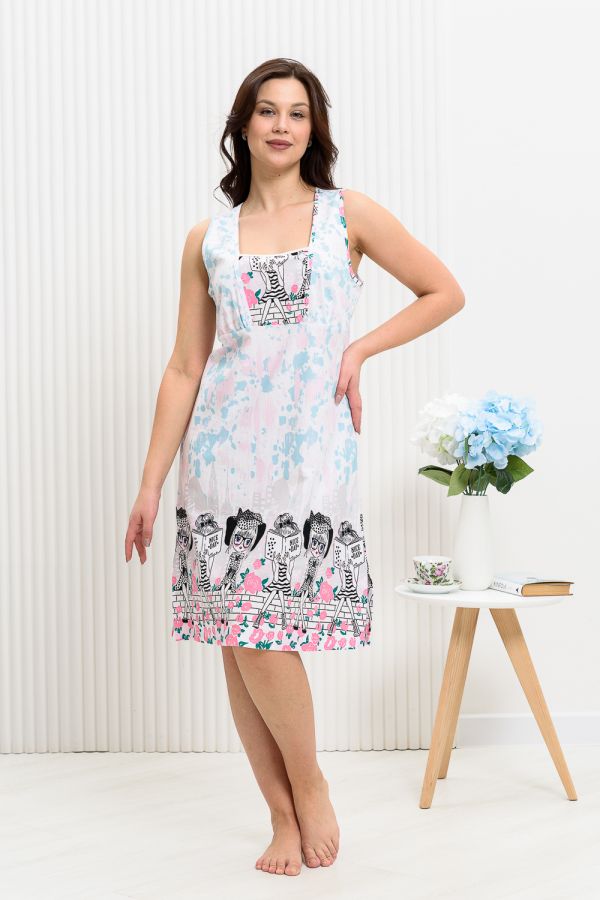 Сорочка на широких бретелях трапециевидного силуэта, длиной ниже колена. Полочка с фигурной горловиной и со сборкой по шву притачивания кокеток. Спинка со складкой по шву притачивания кокетки. Проймы и горловина обработаны бейкой из основного полотна.