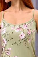 Сорочка на бретелях полуприлегающего силуэта, с фигурной линией низа, длиной выше колена. На полочке внизу обработан декоративный разрез. Проймы, бретели и разрез на полочке обработаны бейкой из основного полотна.