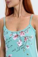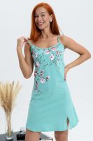 Сорочка на бретелях полуприлегающего силуэта, с фигурной линией низа, длиной выше колена. На полочке внизу обработан декоративный разрез. Проймы, бретели и разрез на полочке обработаны бейкой из основного полотна.